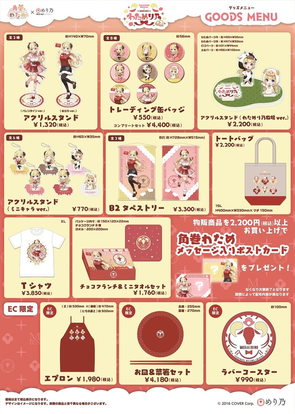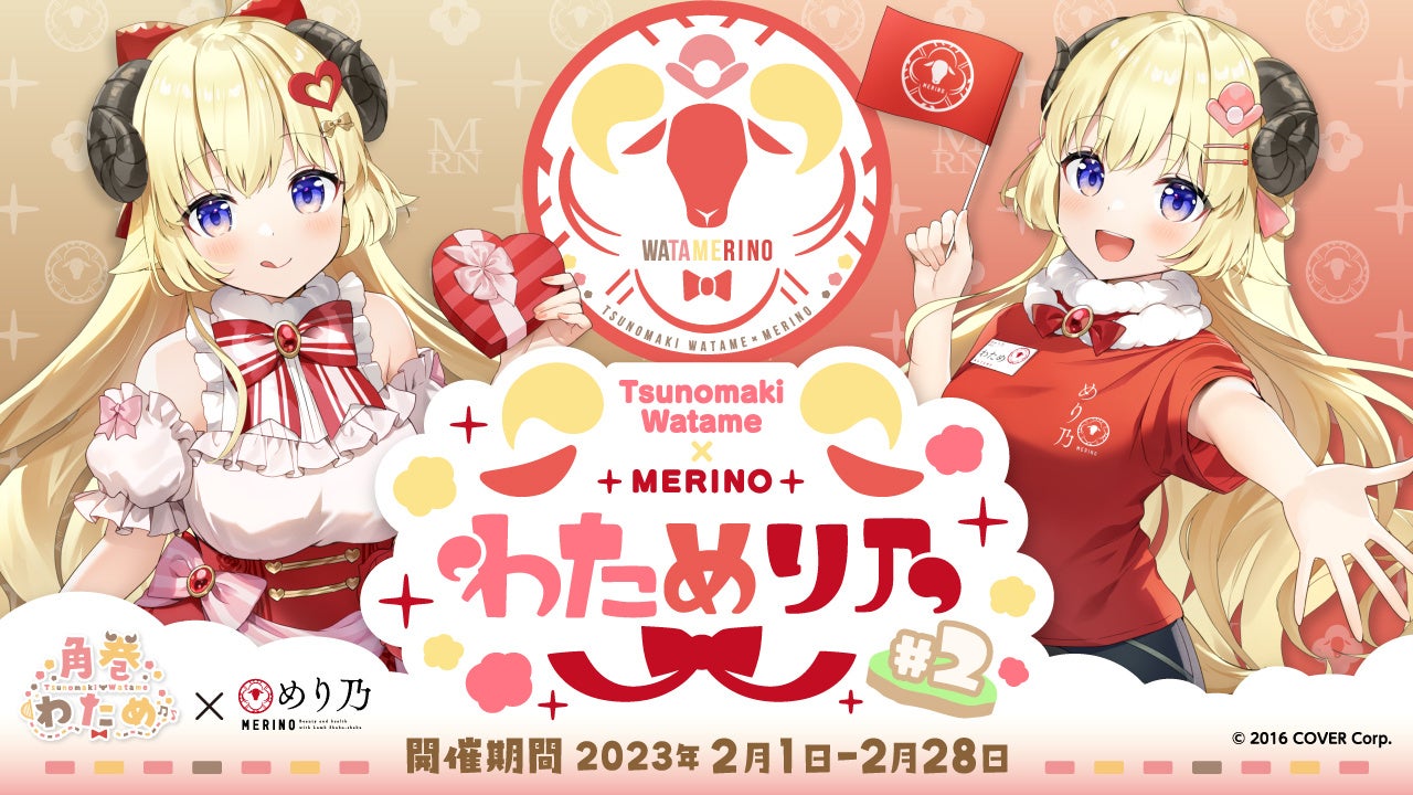 今回の「角巻わため」は、第2弾の特別仕様!めり乃衣装に加え、期間限定で「バレンタイン衣装」で登場!「わためり乃2」特別描き下ろしのオリジナル衣装を着用した、限定コラボグッズを是非お楽しみください。