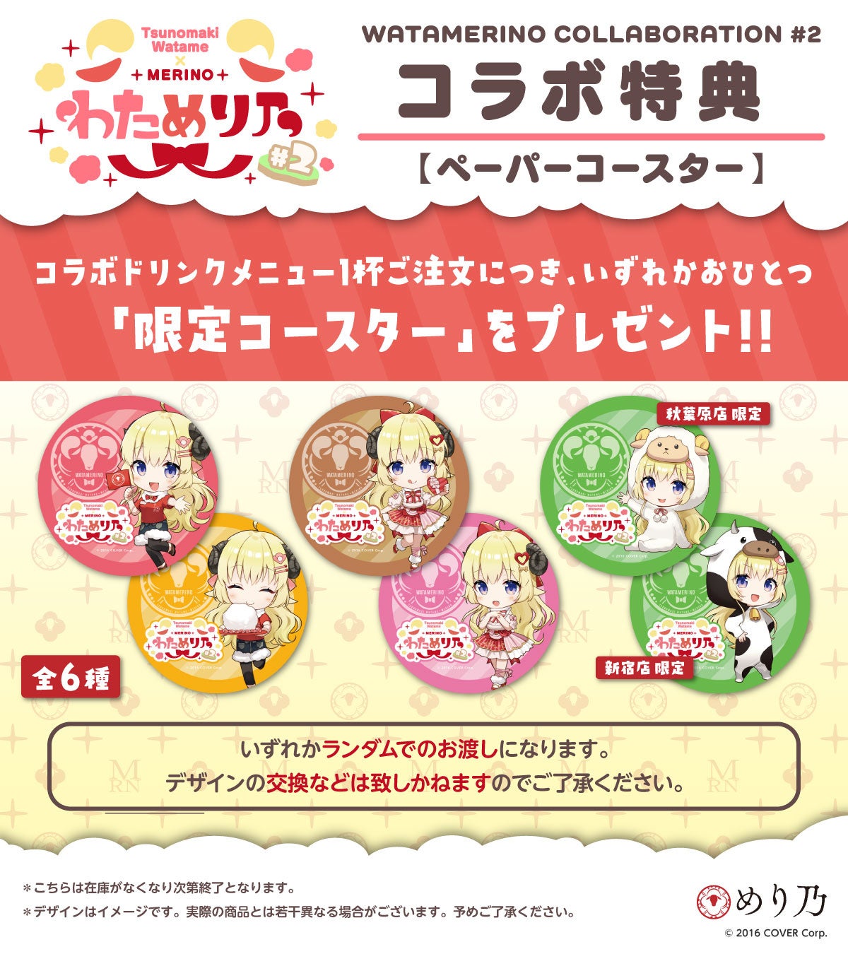 「角巻わため」コラボドリンクをご注文いただいたお客様にオリジナル紙コースターを、1杯につき1枚プレゼント!また、『めり乃秋葉原本店』『めり乃新宿店』限定デザインが各種1枚登場。ぜひお見逃しくなく!※コラボドリンク1杯ご注文毎に1枚お渡しとなります。