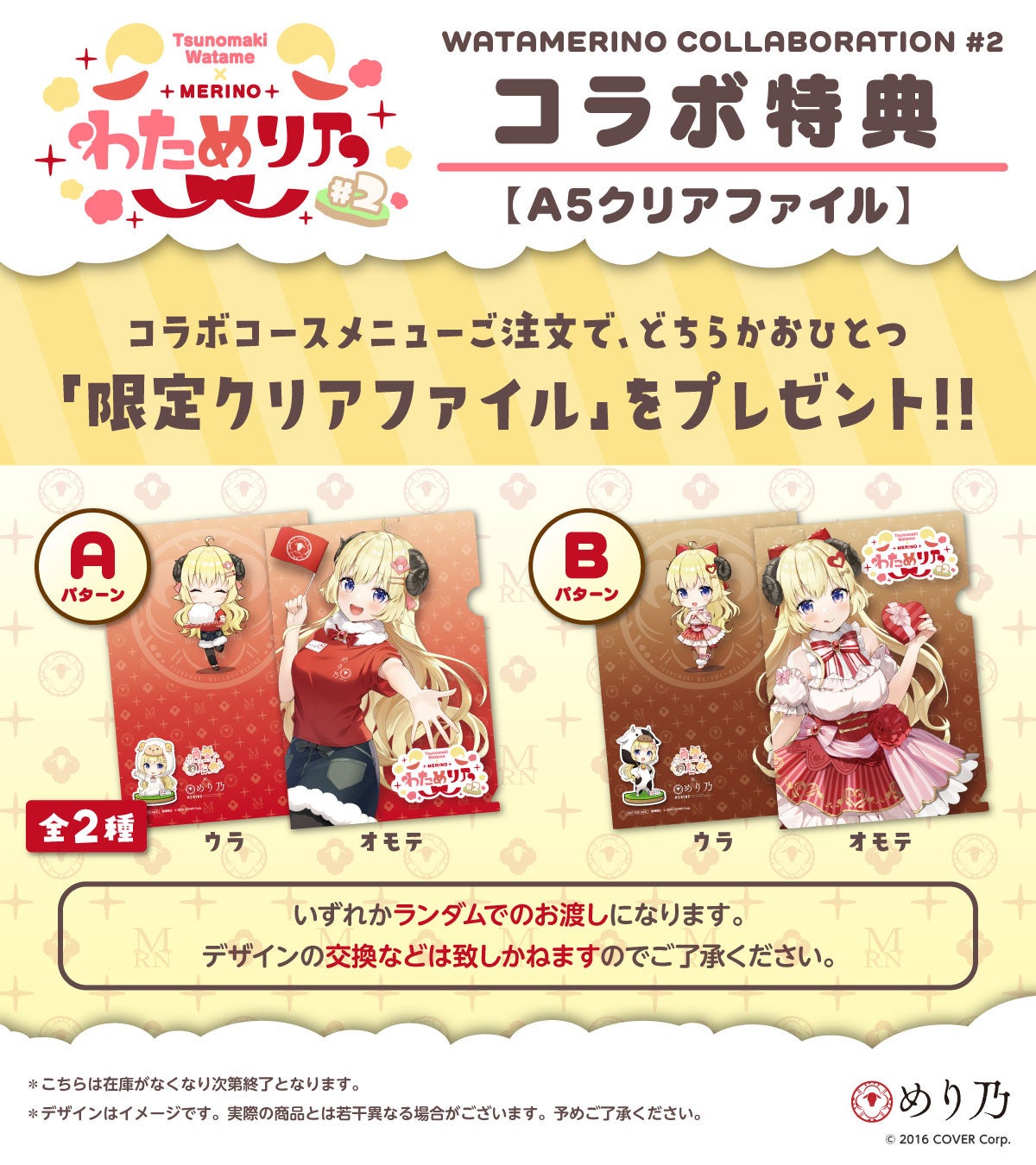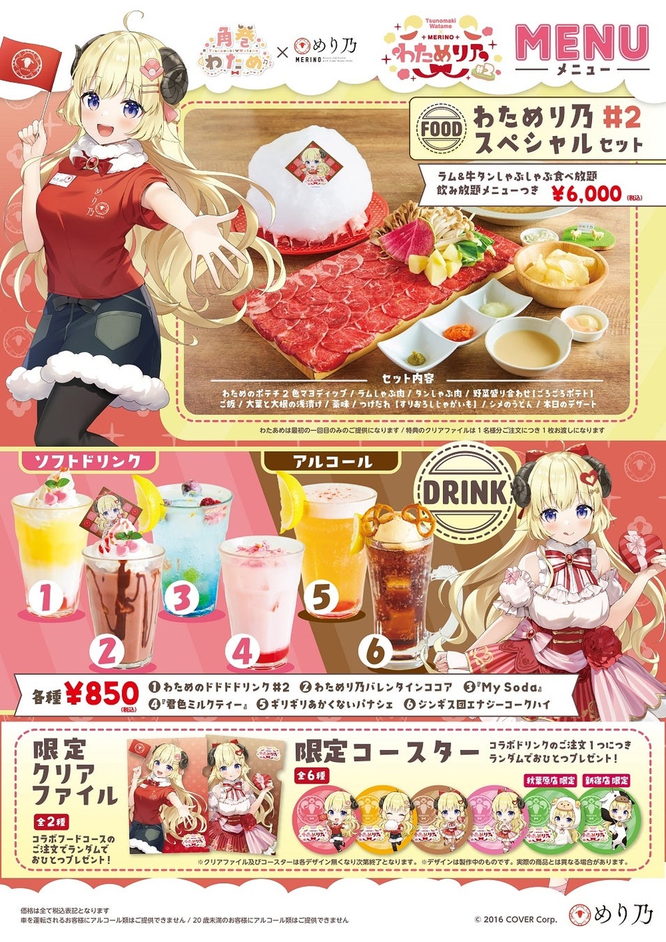羊のタレントである『角巻わため』と、羊肉しゃぶしゃぶが人気の『めり乃』のバージョンアップした豪華コラボメニューが期間限定でお楽しみいただけます。コラボメニューをご注文頂いた方へ、特別描き下ろしイラストを使用した限定クリアファイルや、コースターをプレゼント!さらに、店内は、期間限定で『角巻わため』の装飾と本人による各店舗限定の店内放送も実施予定です。 また、オリジナルグッズの店内販売や、WEB通販にて受注販売も決定!! (WEB通販:https://watamerino.stores.jp/ )