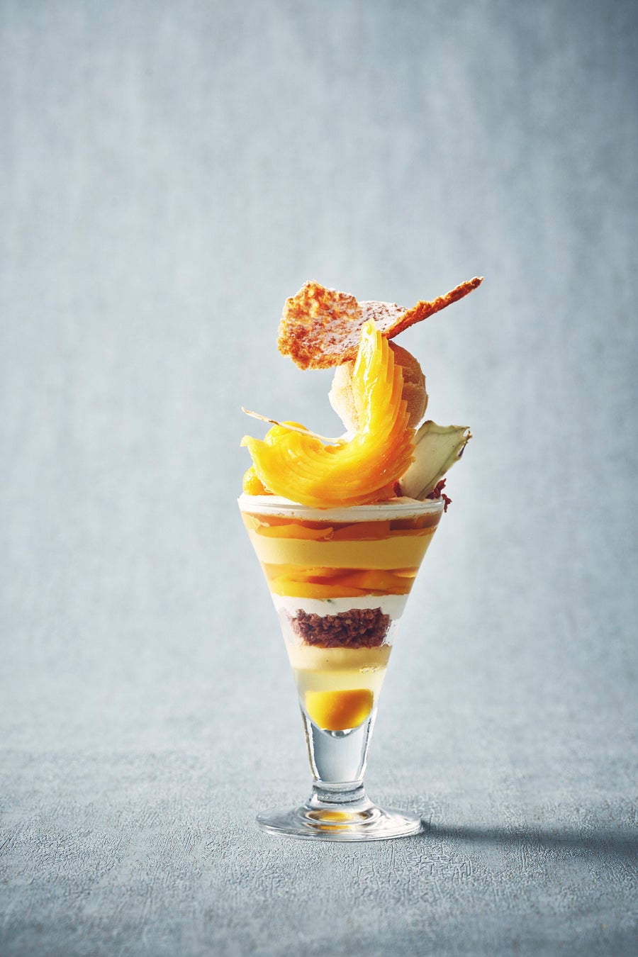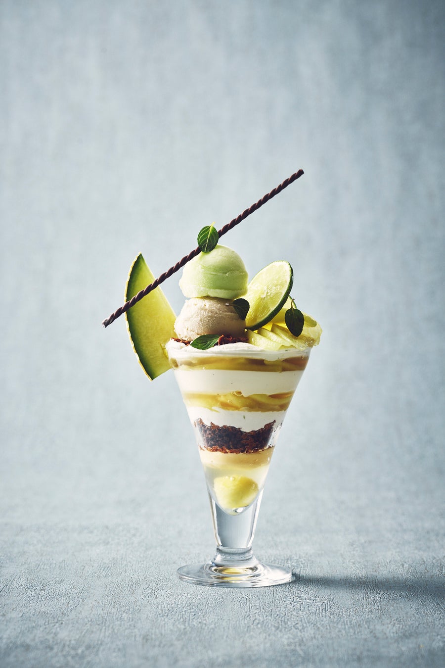 バーテンダーがカクテルメイクをしたかのようなフルーツパフェ。メロンにはモヒート、マンゴーにはモスコミュールをイメージした大人なカクテルパフェにアレンジしました。初夏にぴったりの涼しげなルックスと緻密に計算された美しいレイヤード。フルーツのジューシーな美味しさを存分に堪能できるシェフ長田の自信作です。