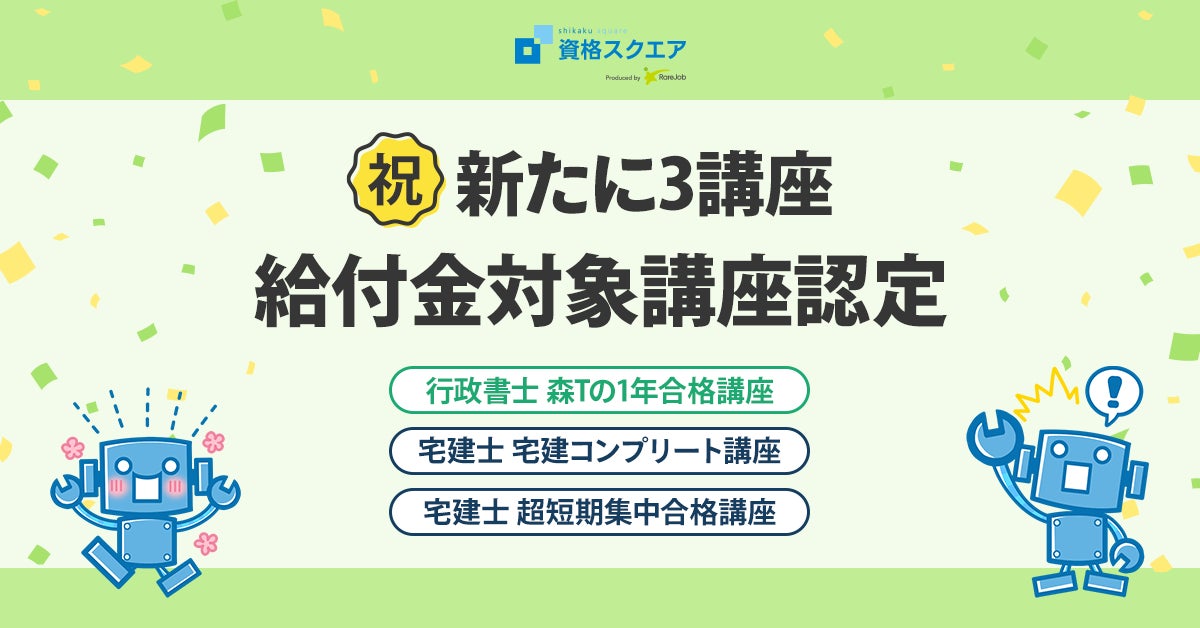 EdTechカンパニーの株式会社レアジョブ(以下、レアジョブ)の運営するオンライン予備校「資格スクエ ア」にて、行政書士講座・宅建講座の一部が10月1日(火)より新しく一般教育訓練給付制度の対象となりました。既存の認定講座と合わせて、行政書士講座にて2講座、宅建講座にて2講座、計4講座が認定を受けることとなります。条件を満たし適用対象になった受講生様は受講料の20%の給付を受けることができるようになりますため、より多くの受講生様にご利用いただきやすくなります。