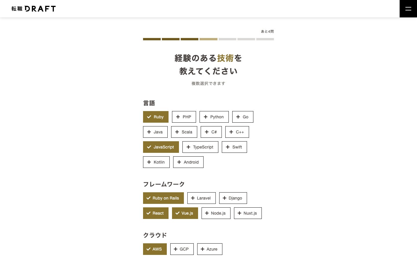 現在の職種と経験年数、プログラミング言語ごとの経験、役職経験など、エンジニアのキャリアに特化した簡単な質問(全7問)に回答していきます。