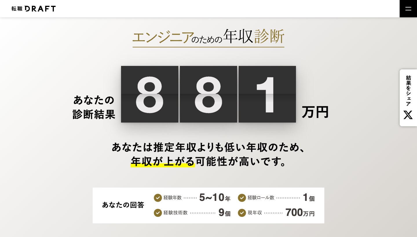 すべての質問に回答し終えると、あなたの推定市場価値(年収)が即座に算出されます。