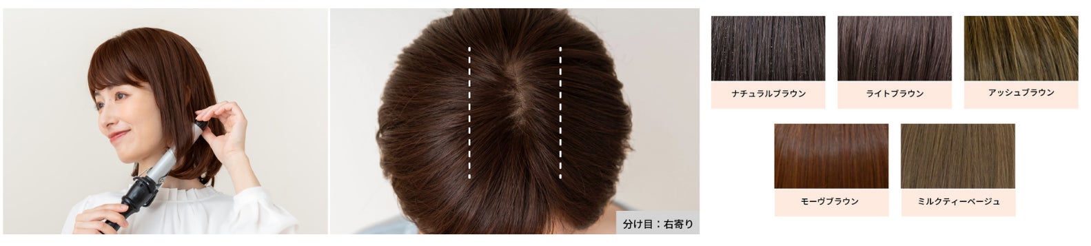 従来のウィッグはご自身でスタイリング変更ができない素材が使用されていましたが、今回の新商品では自由にクセをつけることができる「耐熱ファイバーの毛材」を使用。お客様ご自身がコテやドライヤーを使ってアレンジができ、自由自在にスタイル変更が可能です。また、髪の分け目には幅が広めの人工皮膚を採用したことで、左右自由に好きな分け目を楽しんでいただくことができます。