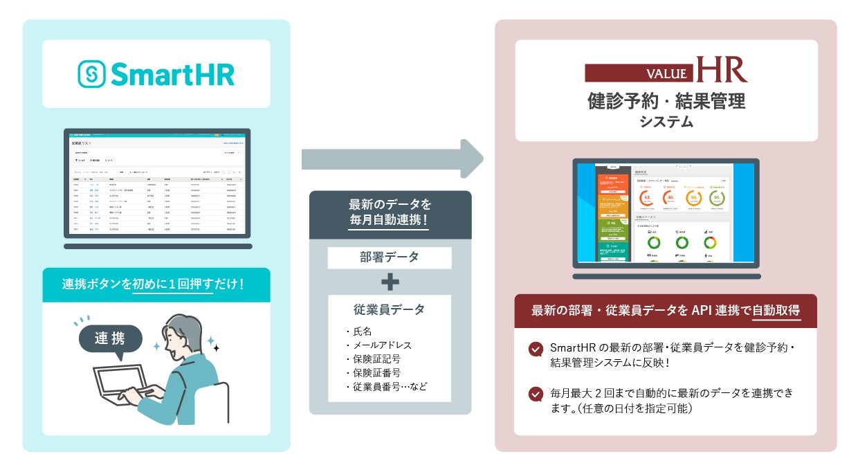 株式会社SmartHR(本社:東京都港区、代表取締役CEO:芹澤 雅人、以下「SmartHR」)が運営するクラウド人事労務ソフト「SmartHR(スマートエイチアール)」は、株式会社バリューHR(本社:東京都渋谷区、代表取締役社長:藤田 美智雄、東証プライム市場、コード:6078、以下「バリューHR」)が運営する「バリューカフェテリア®システム」内で提供している「健診予約システム」並びに「健診結果管理システム」と2022年10月17日よりシステム連携し、協業を開始します。