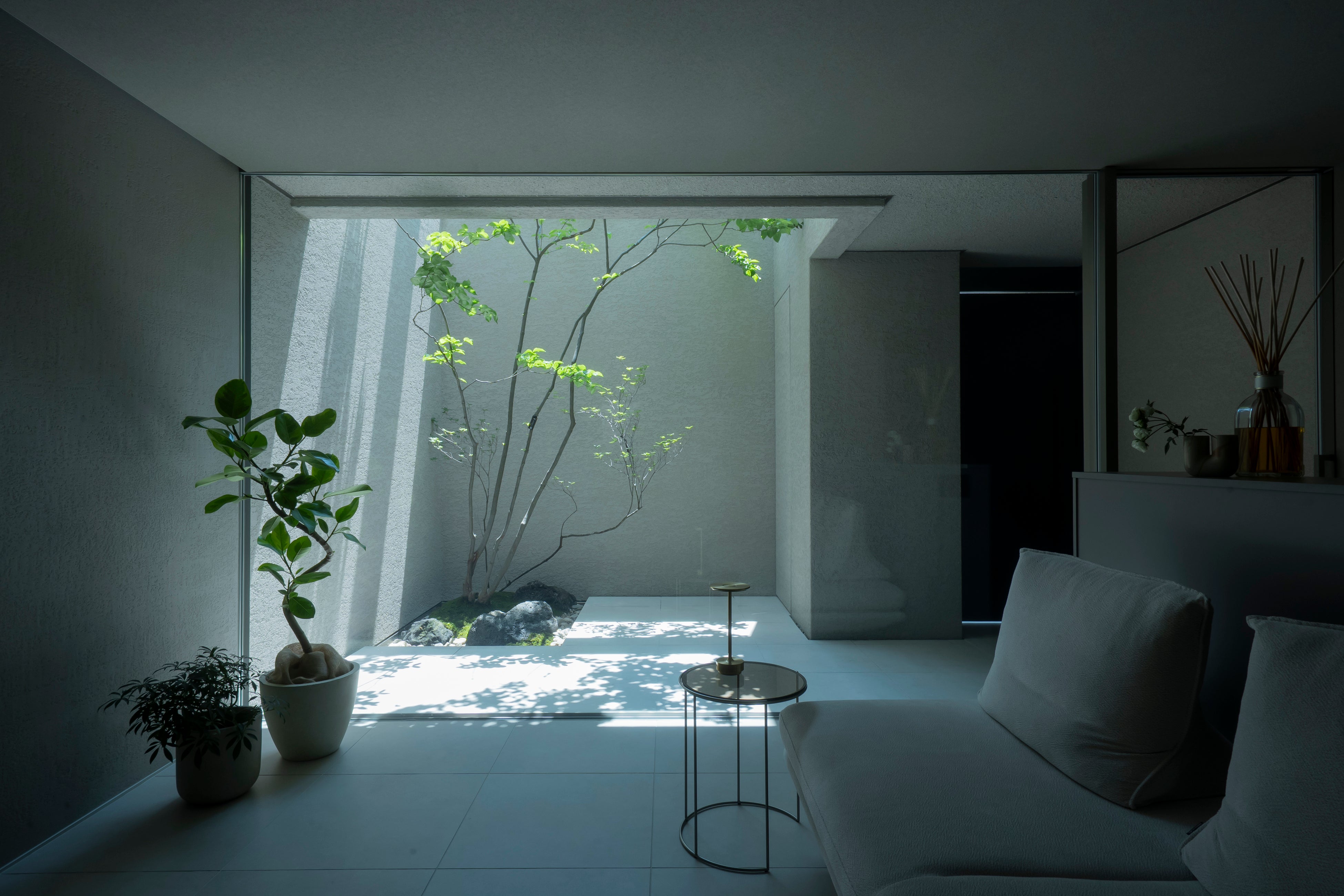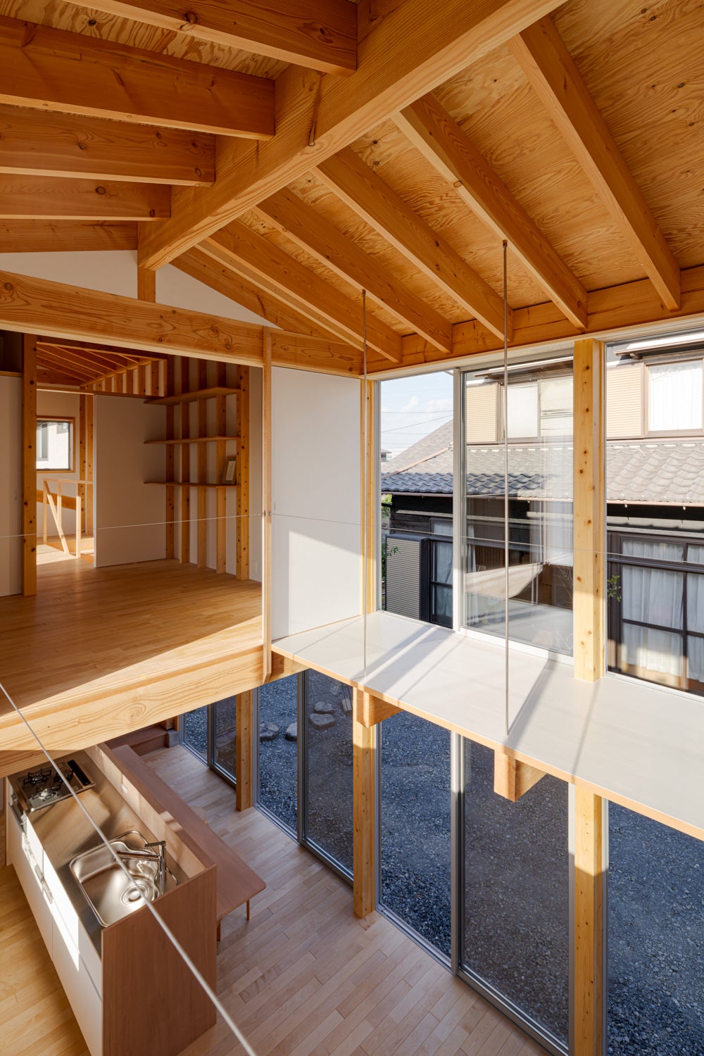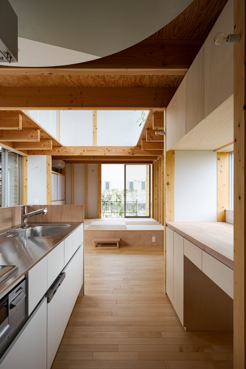 武蔵野台地の舌状の丘に位置する敷地。植栽ポットの隙間を「谷」と見立てたアプローチから高さを抑えた玄関へ入り、階段を上がると緑が広がる開放的な空間。RC腰壁と木造フレームで耐力壁を避け、南北に抜ける眺望を確保し、谷から丘への流れを感じるくらしを実現。