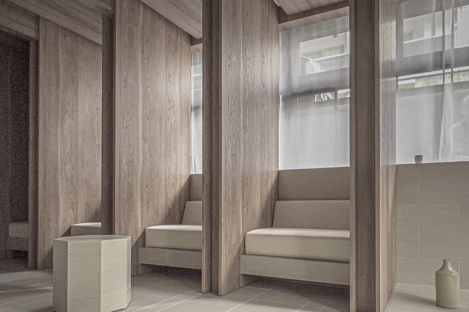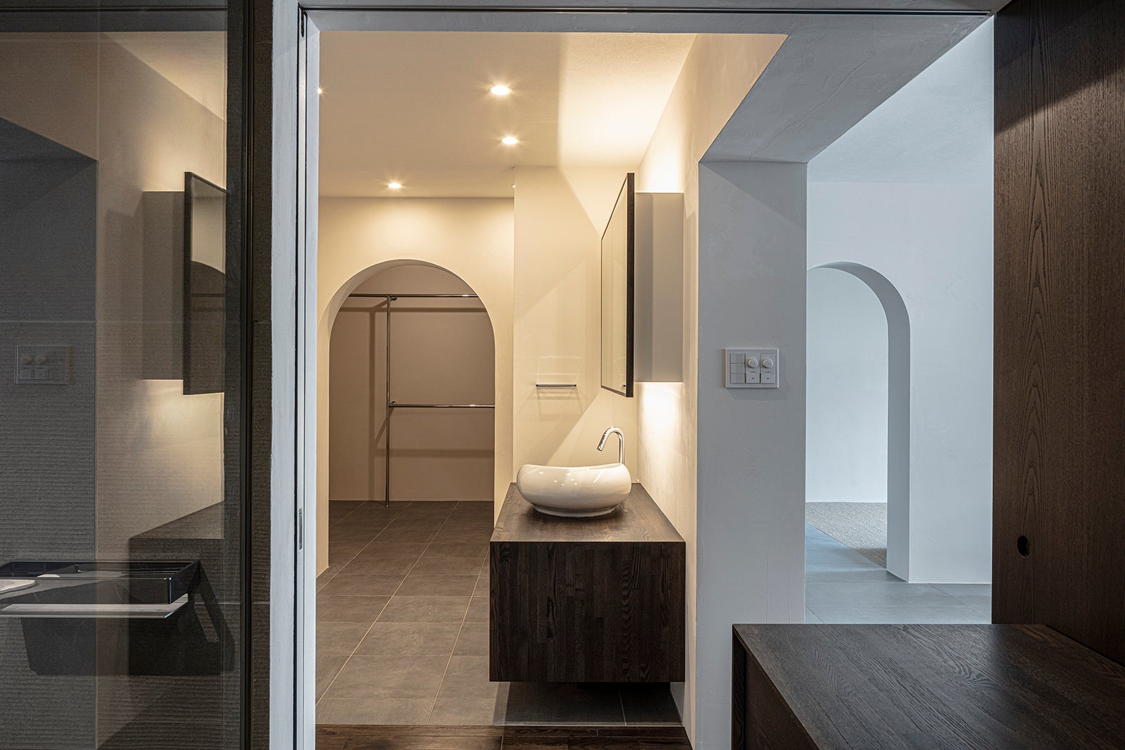 丸みのある石を積み上げたような洗面台。石は川の流れなどで長い時間をかけ、柔らかな丸みを帯び、得も言われぬ美しさを持っている。自然が作り出してくれた、ミニマルな形状を組み合わせ、空間に優しく溶け込むようにデザインした。