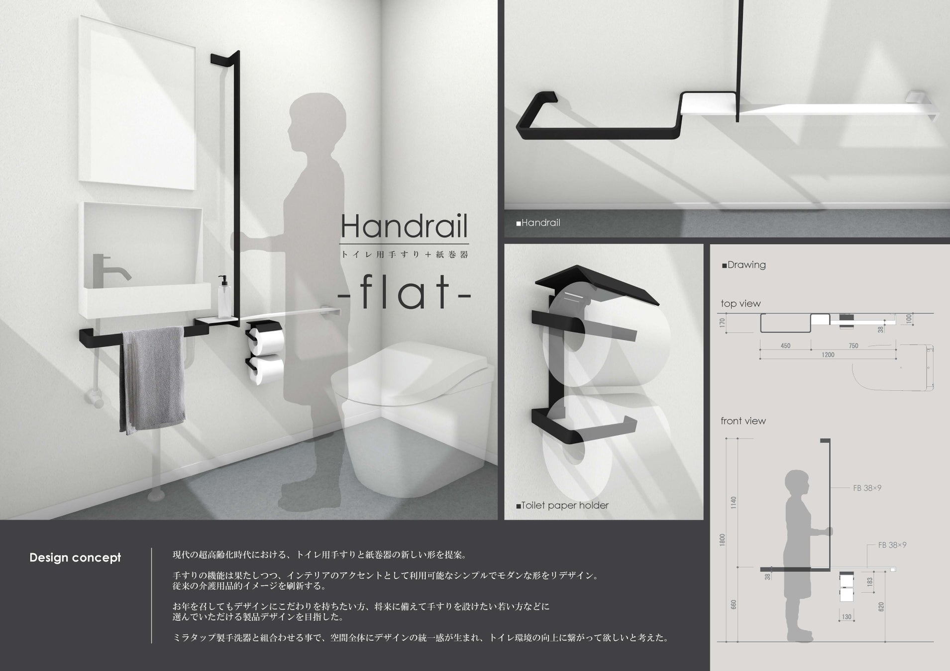現代の超高齢化時代における、トイレ用手すりと紙巻器。インテリアのアクセントとして利用可能なシンプルでモダンな形をリデザイン。お年を召してもデザインにこだわりを持ちたい方、将来に備えて手すりを設けたい若い方などに選んでいただける製品デザインを目指した。