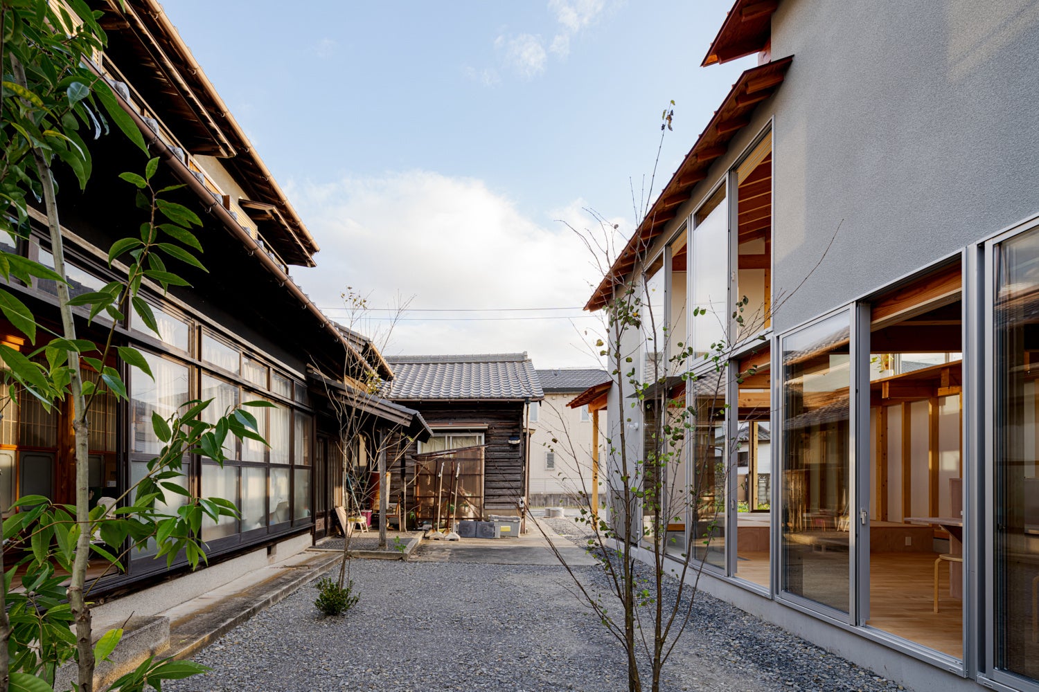 4世代がくらすため、家族が乖離しない建築にしたいと考えた。間口5m奥行37mの細長い敷地に間柱や大垂木を1尺5寸間隔で規則的に並べ、つながりを意識。屋根は4枚に分け、リズムを生み、畑への影を軽減。既存建物と同じグリッドを共有し、家族の一体感を保つ設計とした。