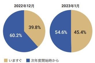 保育士バンク!の利用実績をもとに、当月の園の募集要件で、入職する タイミングが「いますぐ」なのか「次年度開始時」なのかの割合を算出、 前月と比較。