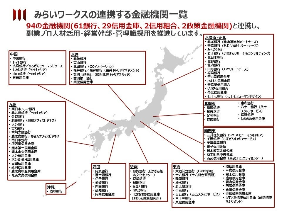 プロフェッショナル人材のフリーランス・副業といった多様な働き方をサポートする株式会社みらいワークス(本社:東京都港区、代表取締役社長:岡本祥治、証券コード:6563、以下「当社」)は、七十七銀行が100%出資する子会社・七十七ヒューマンデザイン株式会社(本社:宮城県県仙台市、代表取締役:庄司大志、以下「七十七ヒューマンデザイン」)と人材支援による地域企業の事業強化を目的とした業務提携契約を締結したことをお知らせいたします。また、今回の七十七ヒューマンデザインとの提携をもって、94の地域金融機関と地方転職・副業人材の活用を推進することとなります。
