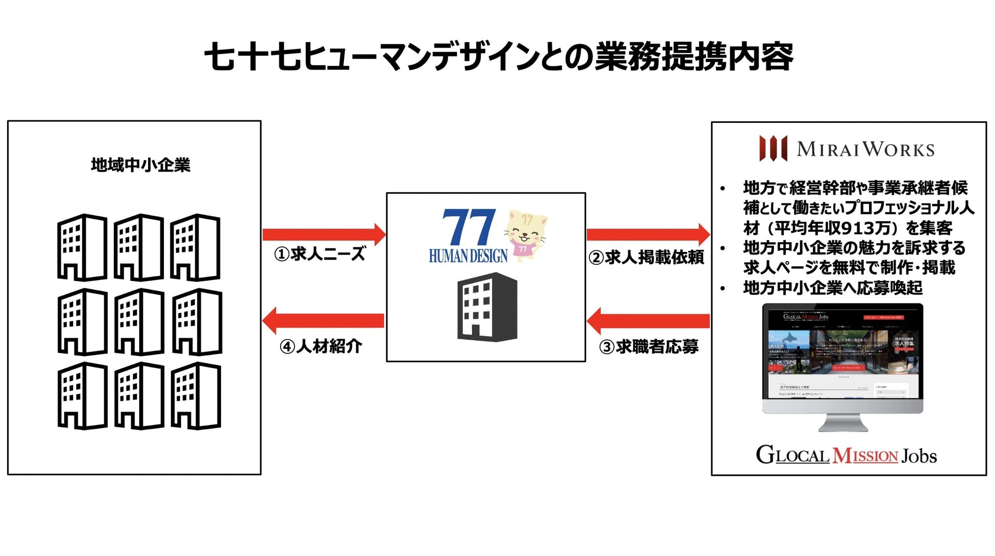 今回、地方中小企業へ経営幹部や事業承継者として転職を希望する都市部人材16,000名以上が登録する『Glocal Mission Jobs(GMJ)』と提携することにより、七十七ヒューマンデザインのお取引先の人材課題解決の強化を目指します。