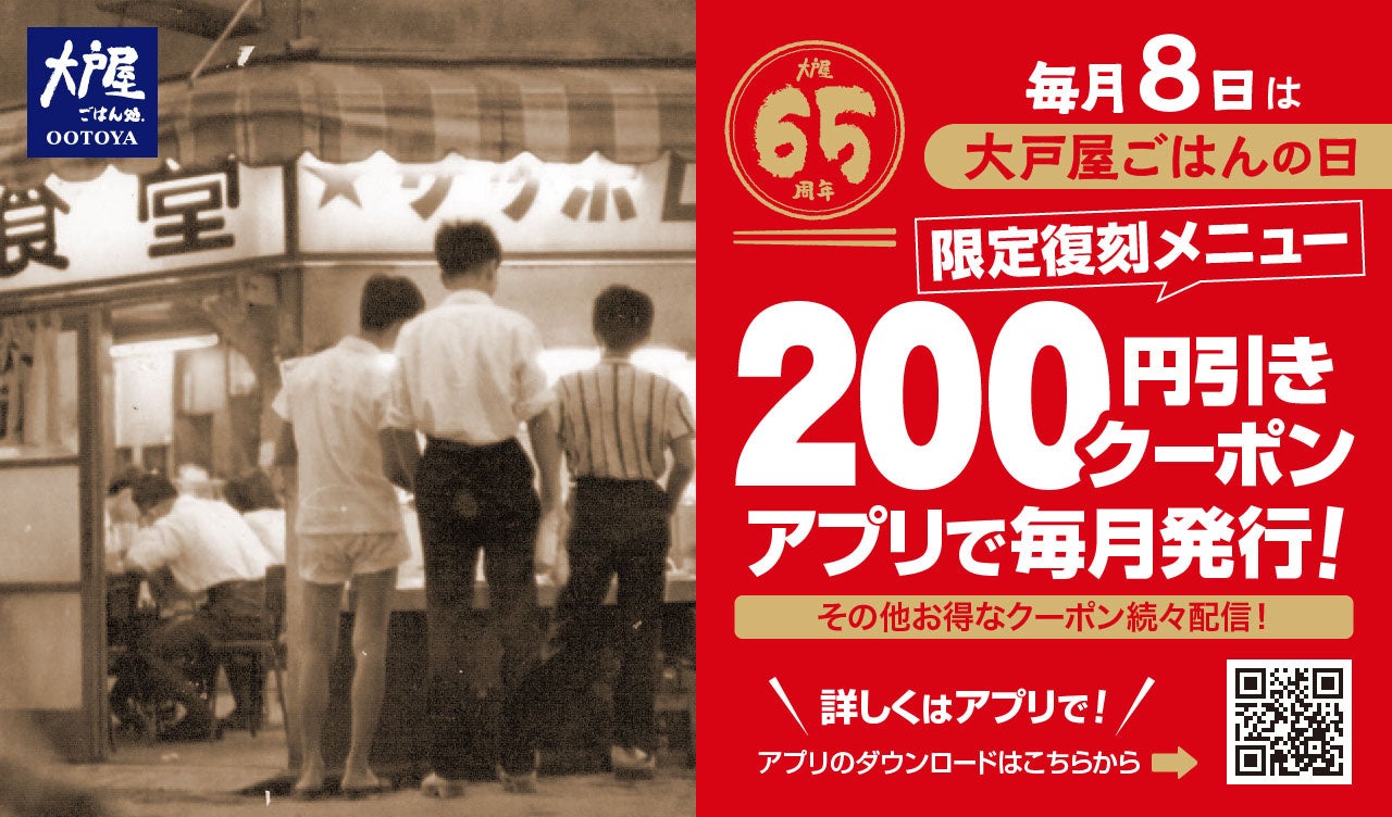 日頃の感謝の気持ちを込めて、大戸屋をもっと身近に、そして、大戸屋でのお食事をより楽しんでいただきたく、毎月8日はお得に楽しく大戸屋をご利用いただけるような、お得なクーポンや65周年限定の様々な特典をご用意しております。