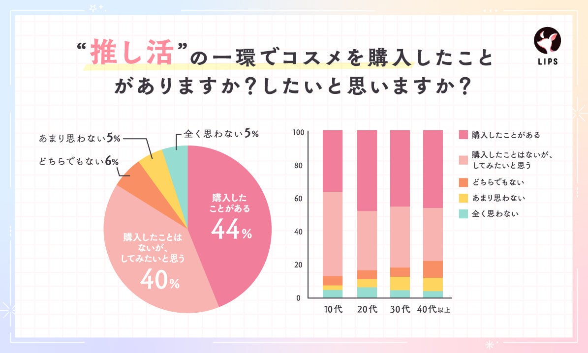 また、次点として「購入したことはないが、してみたいと思う」の回答が40%と、推し活の一環としてコスメの購入を前向きに考える方が非常に多いとわかります。