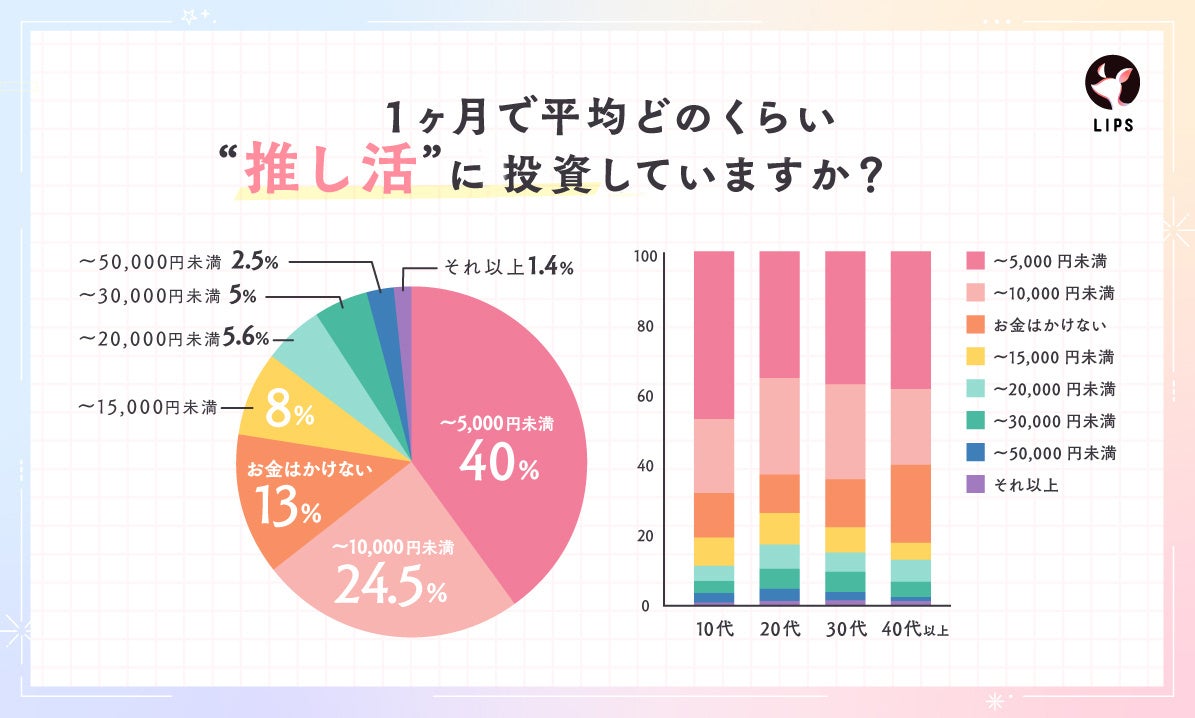 続いて、"推し活"で1ヶ月平均どのくらいお金を使っているのか聞いてみたところ、上位の回答は「〜5,000円未満」(40%)、「〜10,000円未満」(24.5%)、「お金はかけない」(13%)という結果に。
