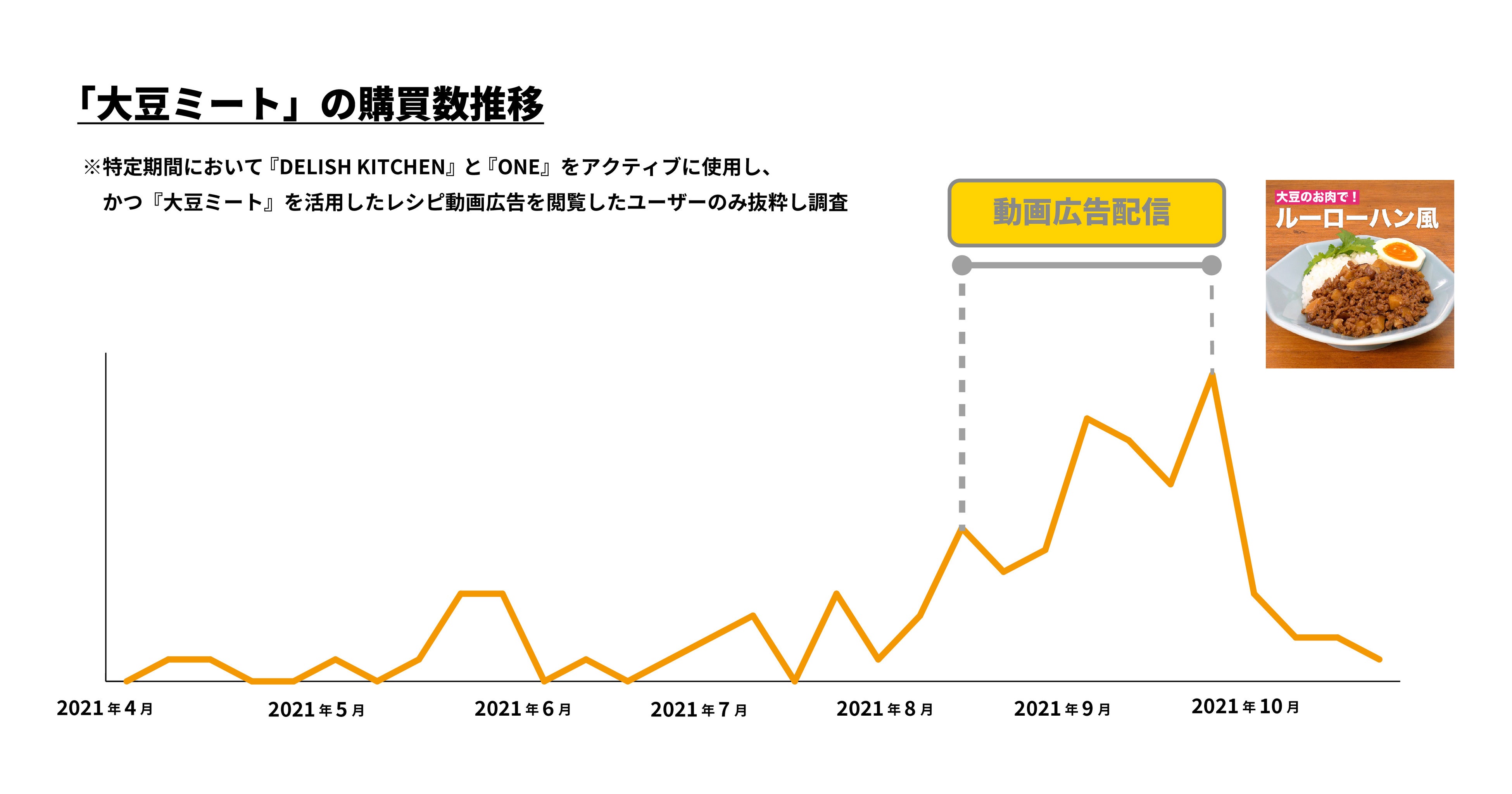 マルコメ(株)の商品「大豆ミート」では、2021年4月から2021年10月の購買数の推移を検証。『DELISH KITCHEN』で制作した「大豆ミート」のタイアップ動画広告「ルーローハン風」のレシピ動画を2021年8月17日から10月1日の期間に『DELISH KITCHEN』 アプリ内でパーソナライズ配信を実施すると、同期間に購買数が大幅に上昇しました。