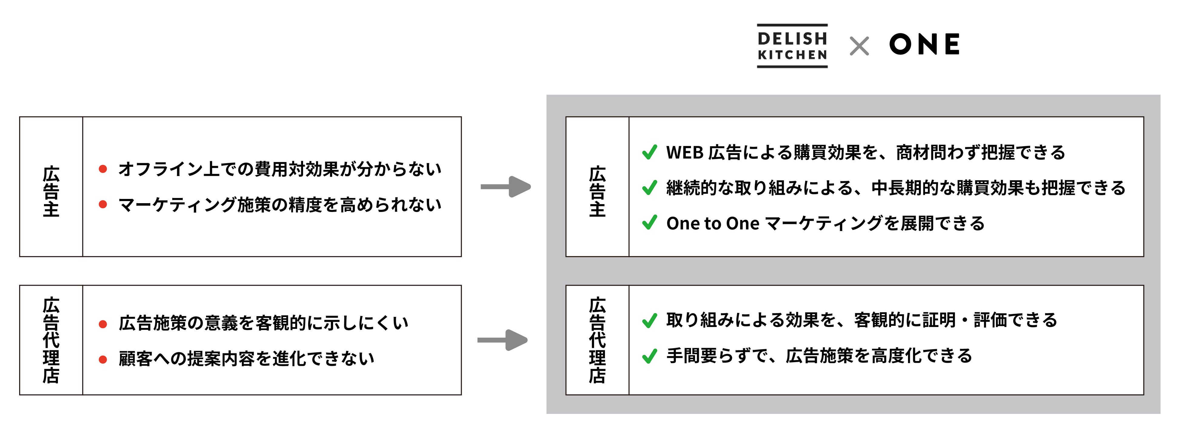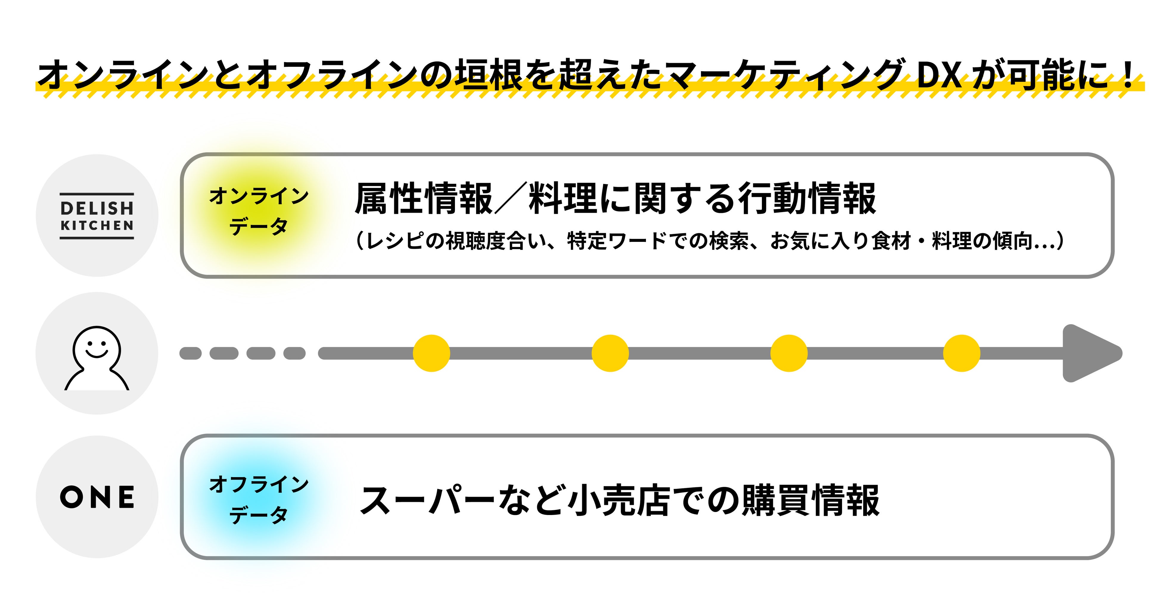 『DELISH KITCHEN』が保有する自社メディアにおけるユーザーデータを、『ONE』が保有する外部購買データと統合することによって、オンラインとオフラインの垣根を超えたマーケティングの精緻化を実現する「レシピ動画広告のオフライン購買検証サービス」の提供が可能になります。認知拡大はもとより、ROI、ROAS、LTVなどの具体的な可視化が求められる広告活動において、いま求められている広告・販促費の最適化を実現します。