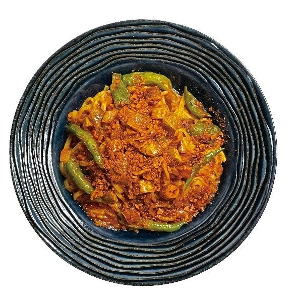 京都府産の伏見唐辛子とハーブの効いたサルシッチャを加え、激辛のアラビアータに仕上げました。ソースに混ぜ合わせた唐辛子、トッピングのフライド唐辛子、ガーリックの効いた唐辛子パウダーの3段階辛味が、単に辛いだけではない、 複雑な辛味と旨味を演出しています。
