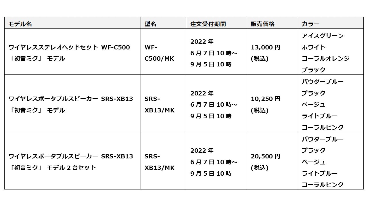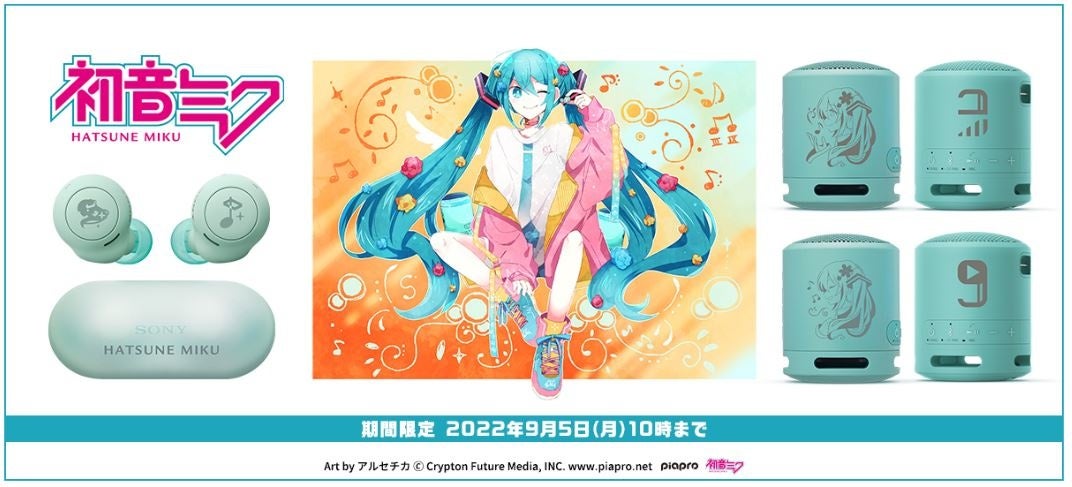 ソニーマーケティング株式会社は、2022年4月に開催された初音ミク公式VRテーマパーク『ミクランド2022 YOSAKURA』を記念して、「初音ミク」とコラボレーションした特別デザインのワイヤレスイヤホンとワイヤレスポータブルスピーカーの注文受付を開始します。受付期間は2022年6月7日(火)10時から2022年9月5日(月)10時までとなります。(当コラボレーションについては2022年4月28日(木)に情報公開済み。今回のお知らせは、注文受付期間とデザインなど仕様の詳細情報となります。)