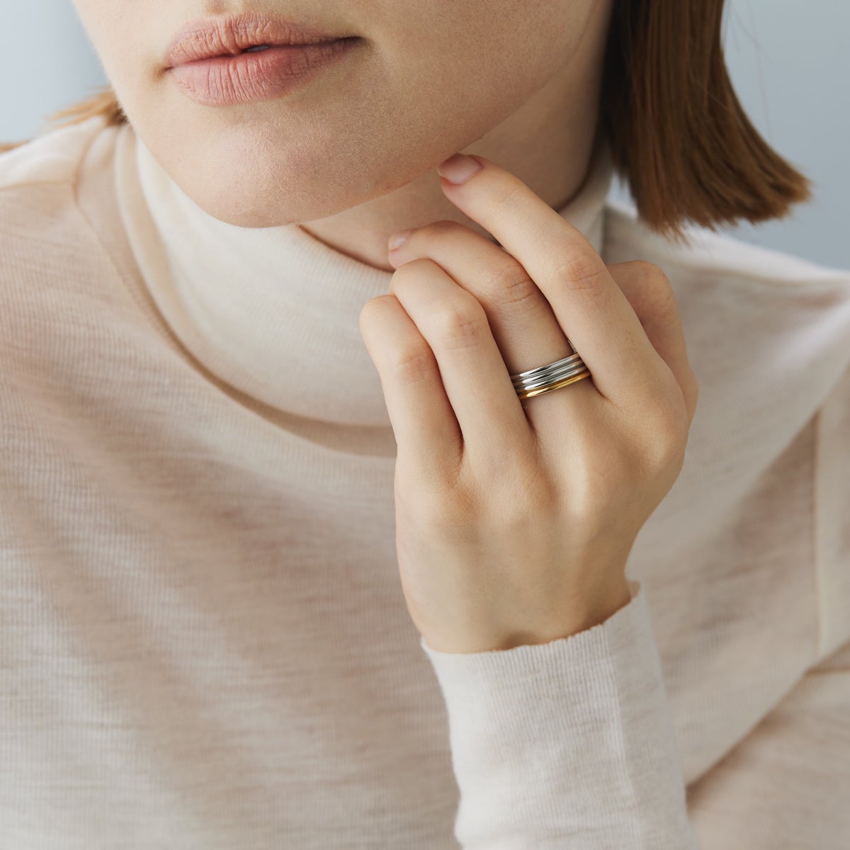 同デザインで耳元と手元のトータルコーディネートもおすすめです。リングは10号~20号の6サイズ展開、バングルは2サイズ展開で、自由な着こなしが可能に。あなただけのアイデンティティが光る手元を演出して。