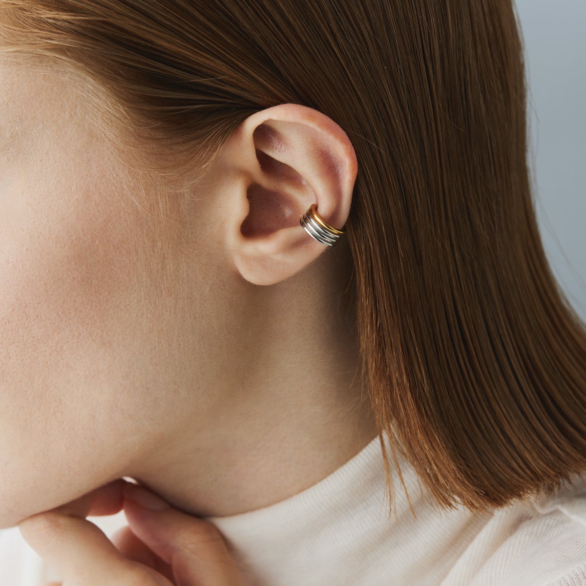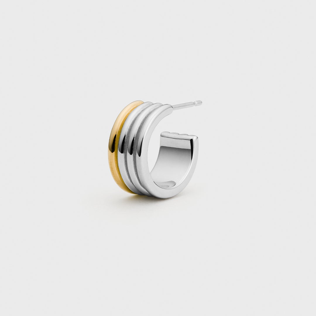 一本のラインにゴールドコーティングを施したバイカラーデザインは、着け方によって印象が変わる魅力的なアシンメトリージュエリー。ネックレスやヘアセット、トップスに合わせて着ける耳を変えて、あなたらしい表情に。