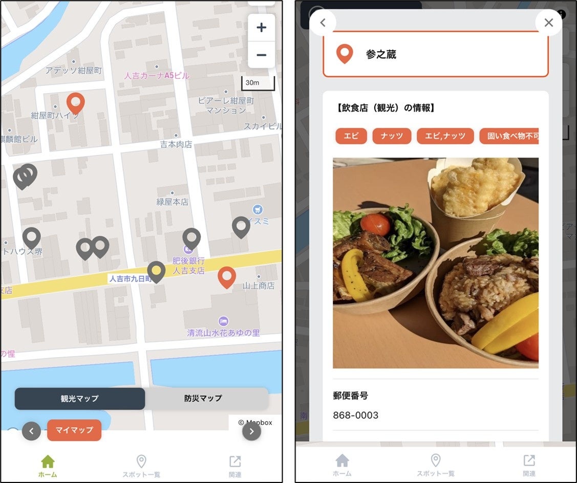 参加者のパーソナルデータ(例:アレルギー情報、乳幼児連れなど)を基に、属性に合った飲食店を観光デジタルマップ上で表示し、参加者はこのマップを使って飲食店の予約を行います。飲食店側では、参加者の提供したパーソナルデータ(アレルギー情報等)を考慮して、来店に向け調整された食事メニューを提供します。この一連の体験の後、参加者からのフィードバックをヒアリングし、サービスの効果と改善点を評価することができました。