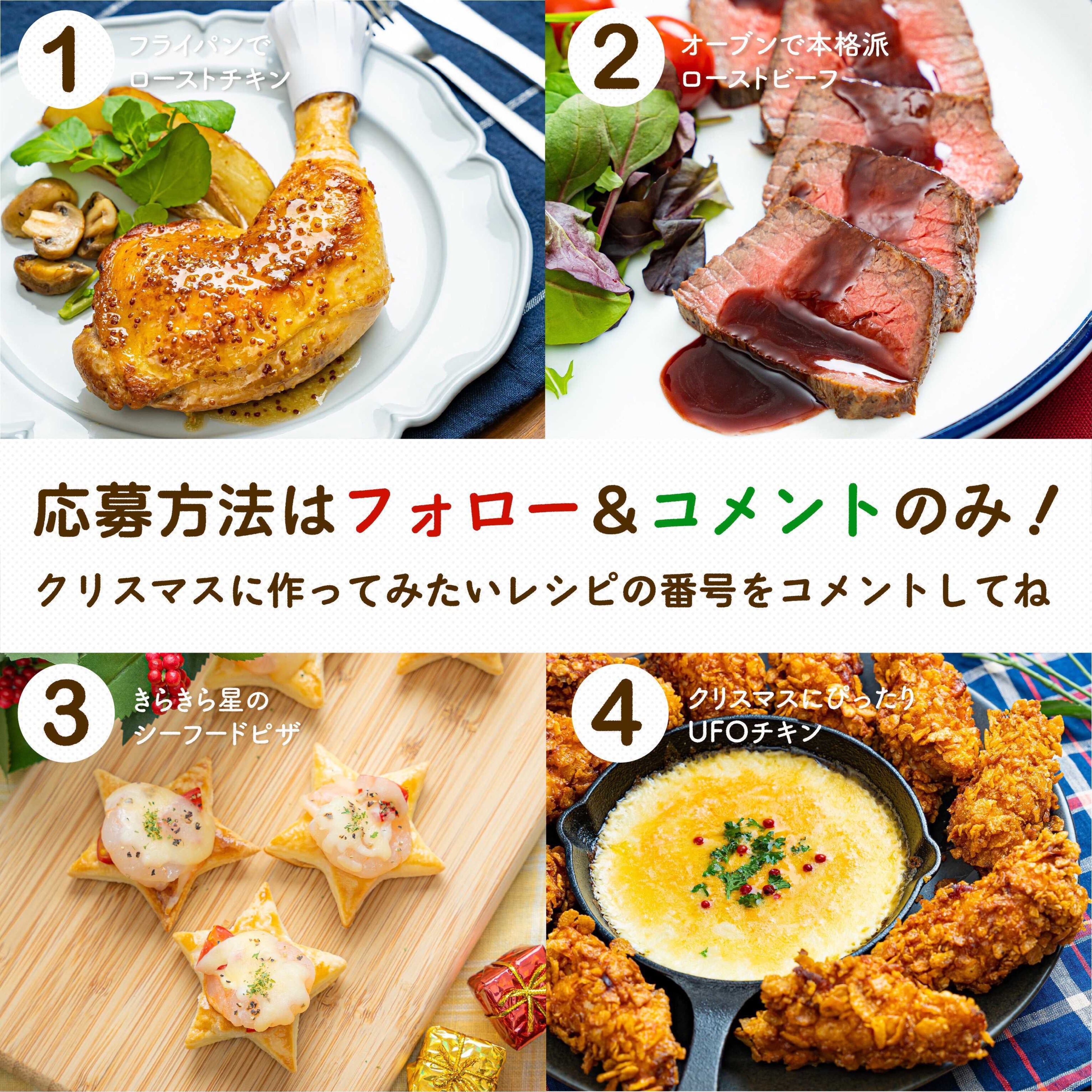 「あなたのクリスマスを応援」キャンペーンの投稿でおすすめされている4つのレシピのうち、お好きなものの番号をコメントしてください。