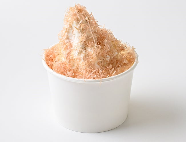 北海道根釧牛乳で仕立てたソフトクリームに、鰹節専門店にんべんのふわふわとした極細糸削りと、アクセントに「本枯鰹節 かつお塩」をひとつまみ加えたビジュアルが印象的な一品です。