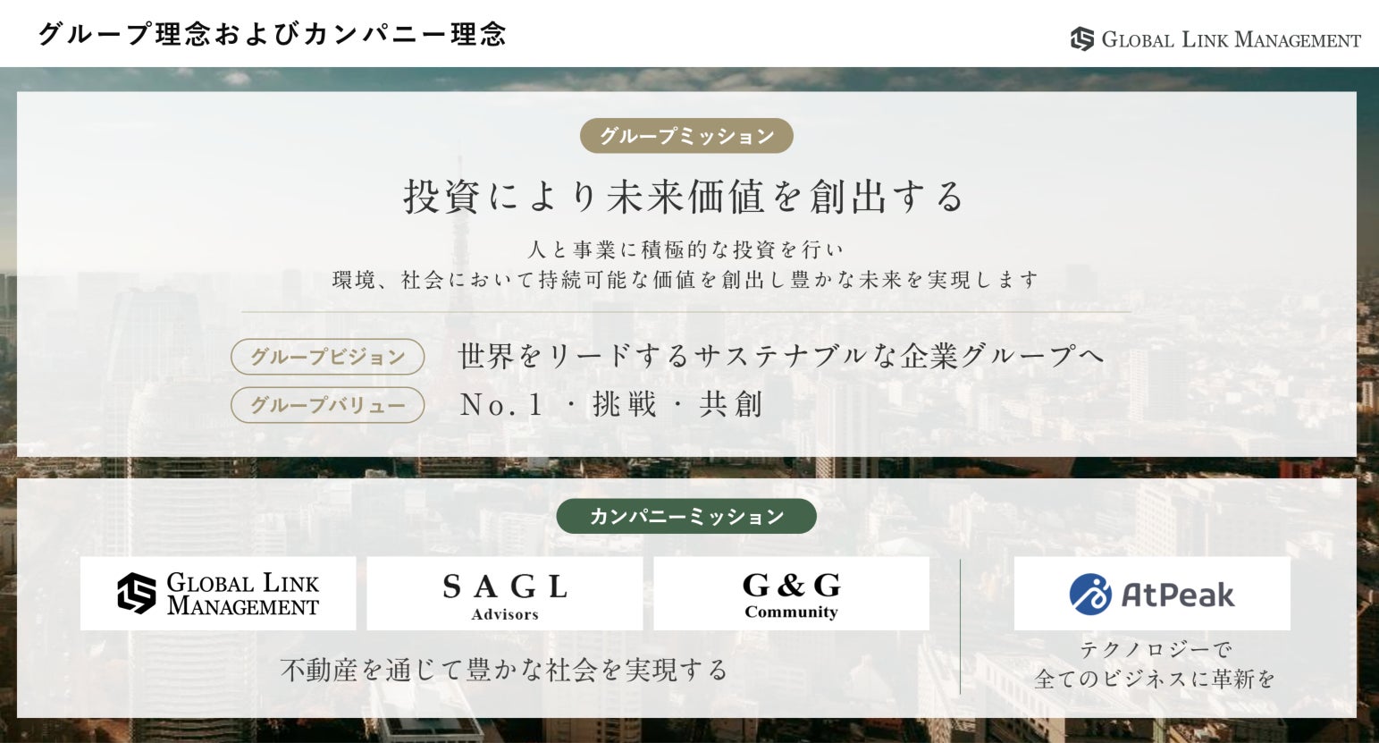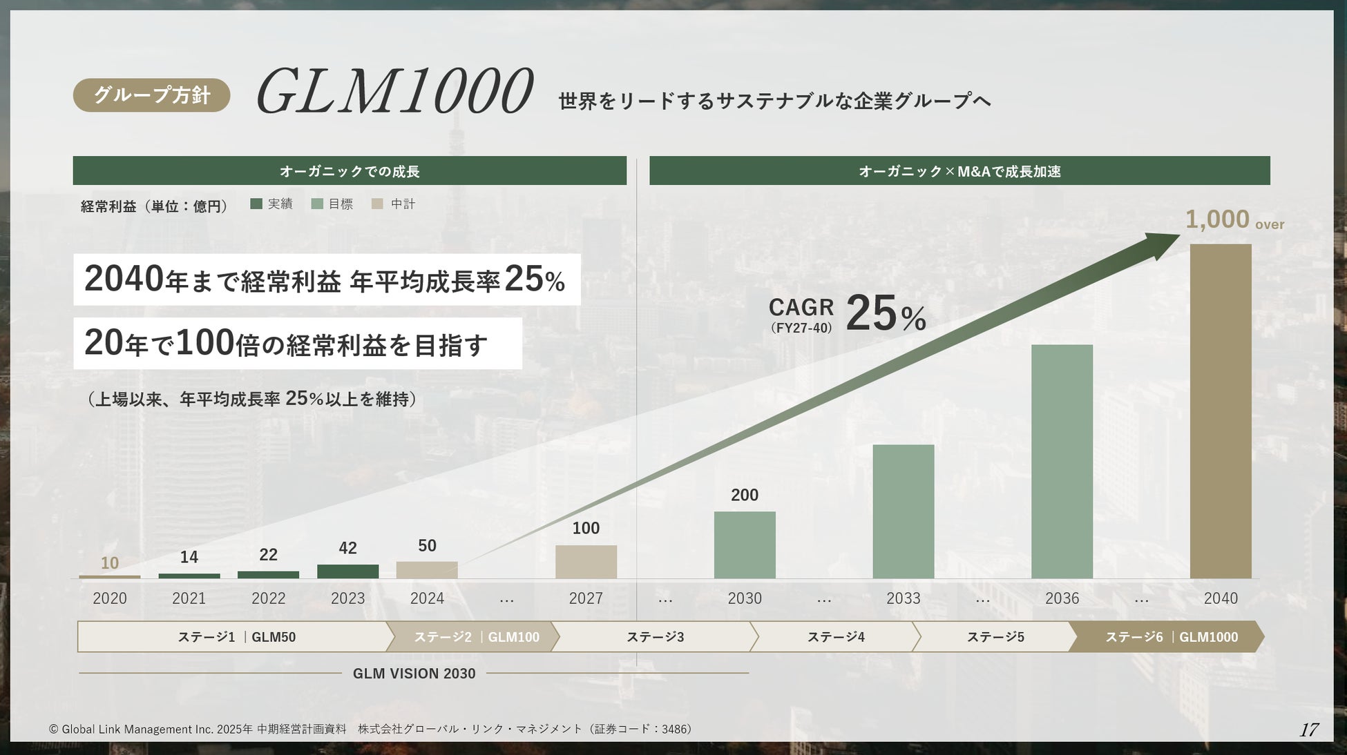 そのような状況のもと、事業領域にDX領域が加わった我々の企業成長目標、グループとしてのミッションやビジョンについて経営陣で議論を重ね、次期中期経営計画のスタートとなる2025年1月からのGLMグループ理念のミッションとして「投資により未来価値を創出する」、グループビジョンとして「世界をリードするサステナブルな企業グループへ」を制定します。また、それを実現するため、2040年12月期に向けたグループ方針「GLM1000」および2025年中期経営計画「GLM100」(2025-2027年)を策定しました。
