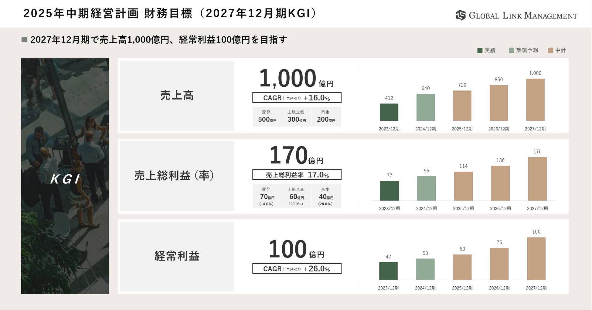 2027年12月期において、売上高1,000億円、売上総利益170億円、経常利益100億円をKGIとして設定しました。