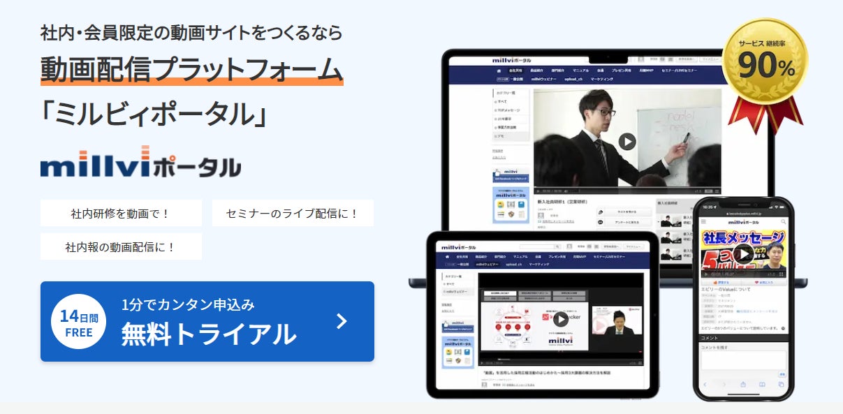昨今、社内の情報共有を「動画」で行う動きが各企業で活発になったことや、セミナー・講座のオンライン開催が増加したことで、『millviポータル』は社内の情報共有やマニュアル、社内研修、また外部に向けたセミナーや講座配信の用途で業種問わず数多くの企業の方々にご利用いただいております。