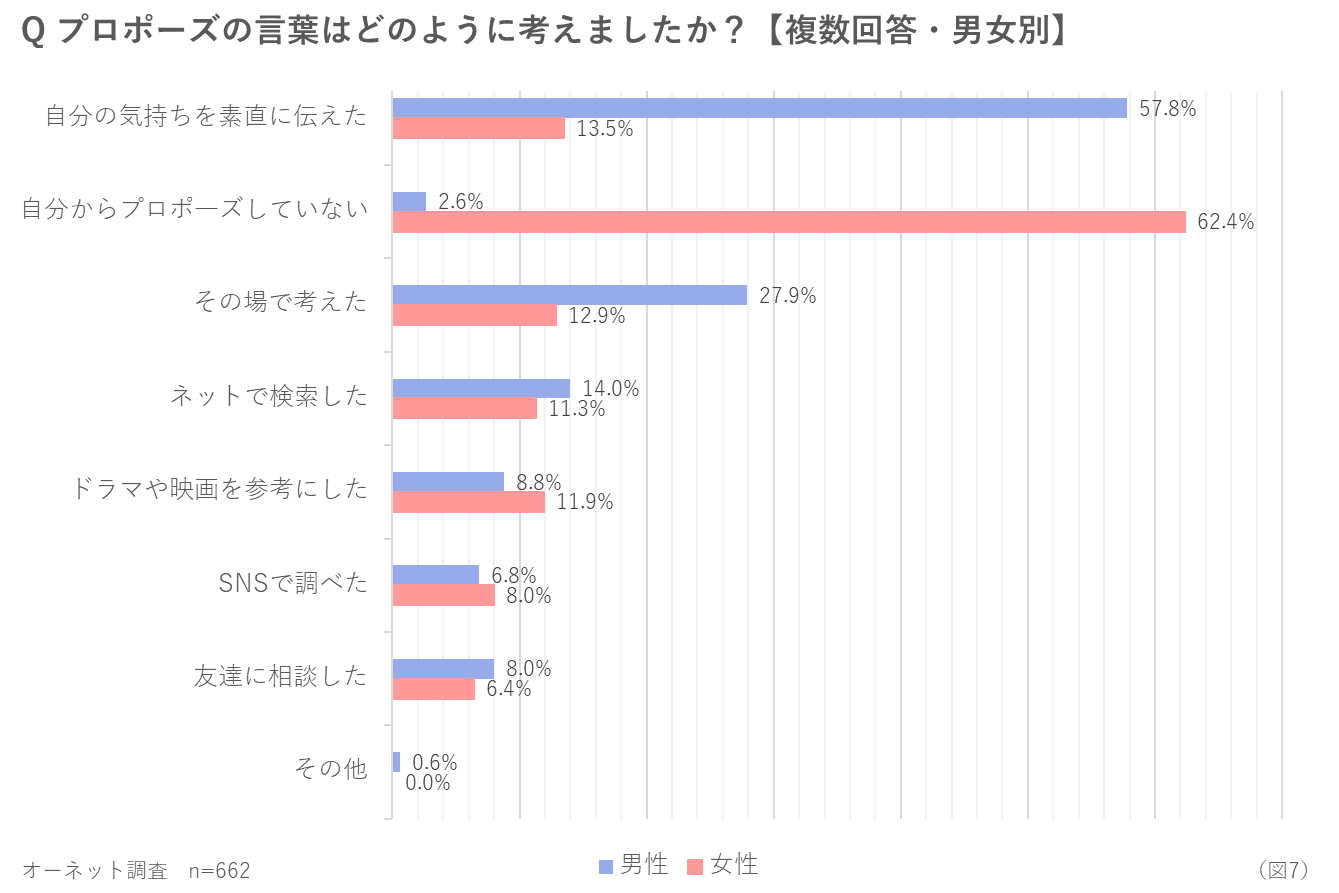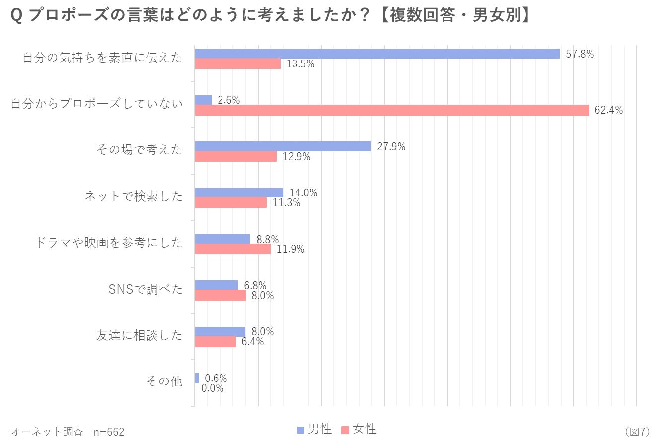 男女別で見ると、男性は「自分の気持ちを素直に伝えた」の割合が高く57.8%という結果となった。次いで「その場で考えた」が27.9%、「ネットで検索した」が14.0%。 女性は「自分からプロポ―ズしていない」が62.4%とダントツで高い結果となり、男性からのプロポーズが一般的であることがうかがえる結果となった。