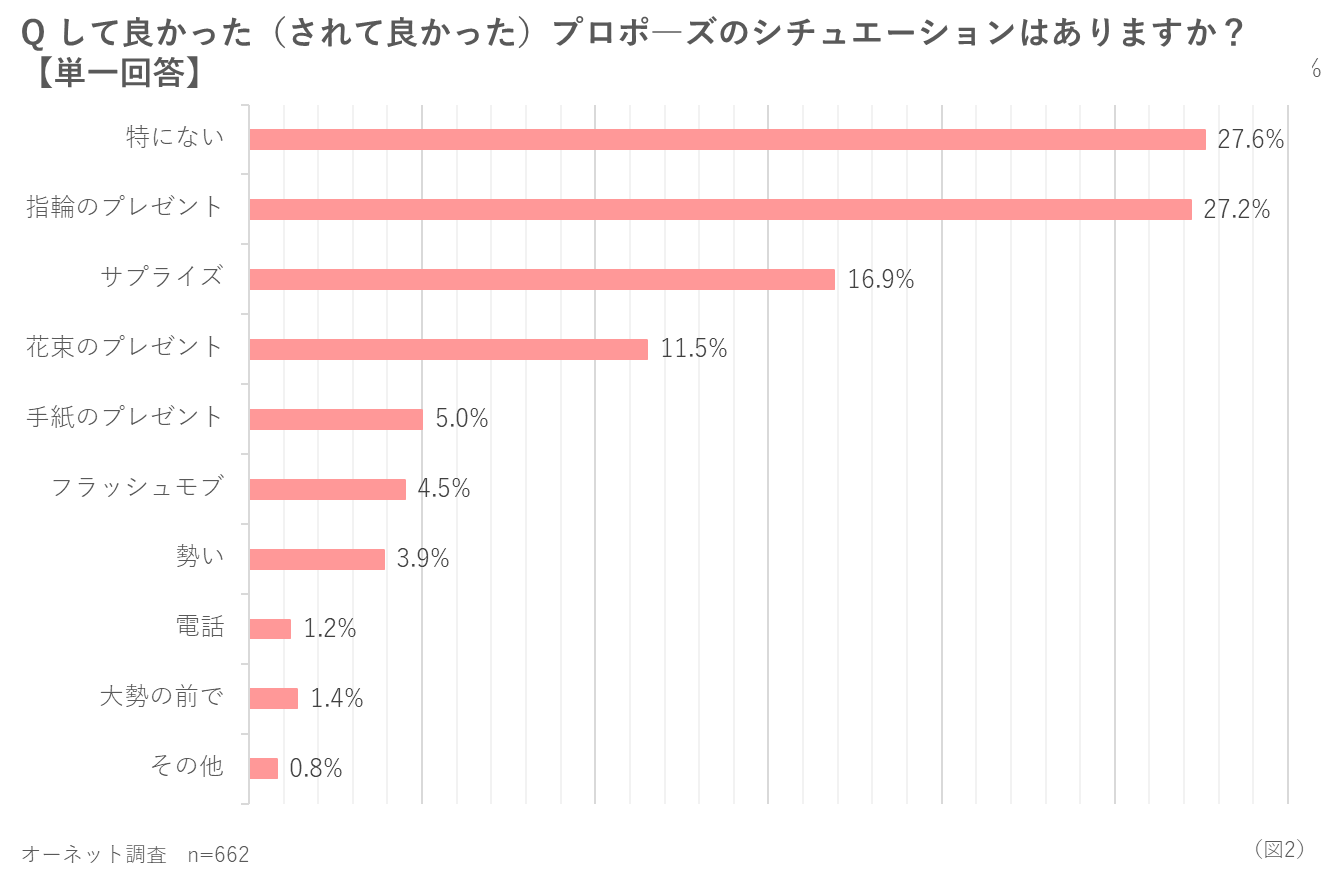 「して良かった(されて良かった)プロポーズシチュエーション」については、約7割がプロポーズの具体的なシチュエーションを選択した。「特にない」を除いて票が集まったのは、「指輪のプレゼント」で27.2%。次に多かった「サプライズ」に10ポイント以上の差を付けてダントツのトップとなった。