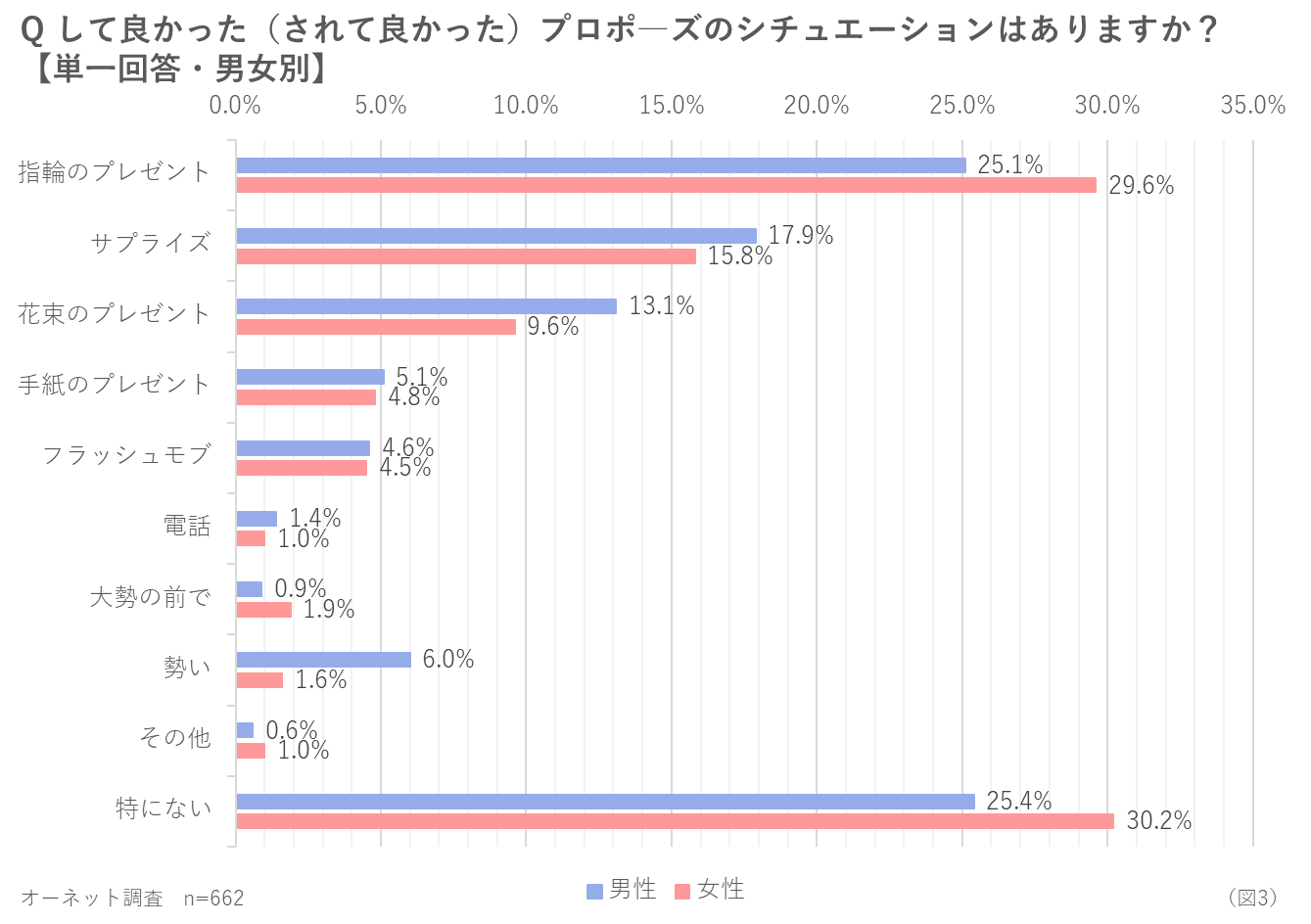 ✓良かったプロポーズのシチュエーションは男女ともに、「指輪のプレゼント」で、約3割が回答。