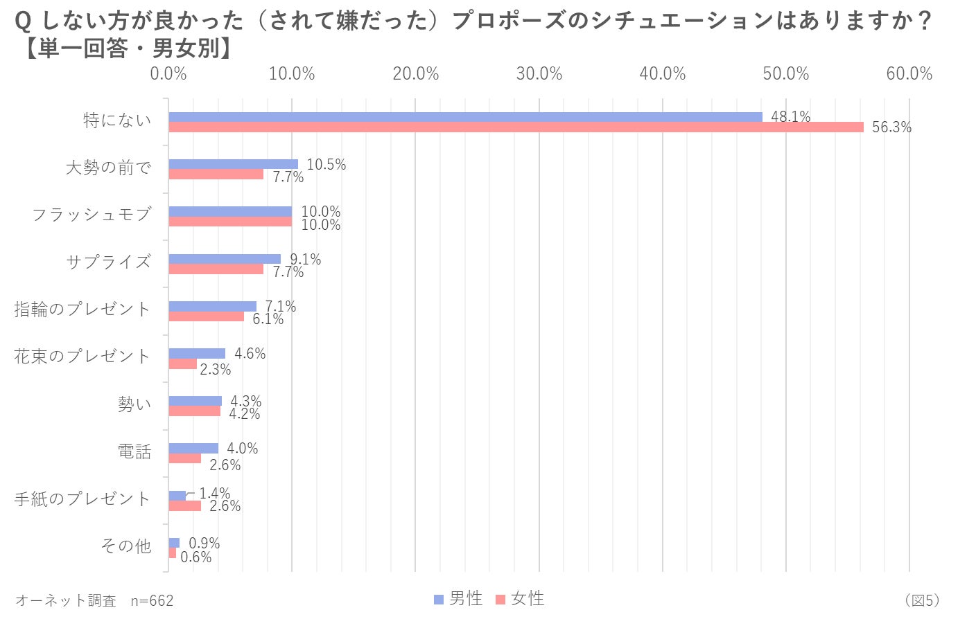 ✓しない方が良かった(されて嫌だった)プロポーズのシチュエーションは「特にない」と回答した人が半数以上。特に女性は56.3%と票が集まった。