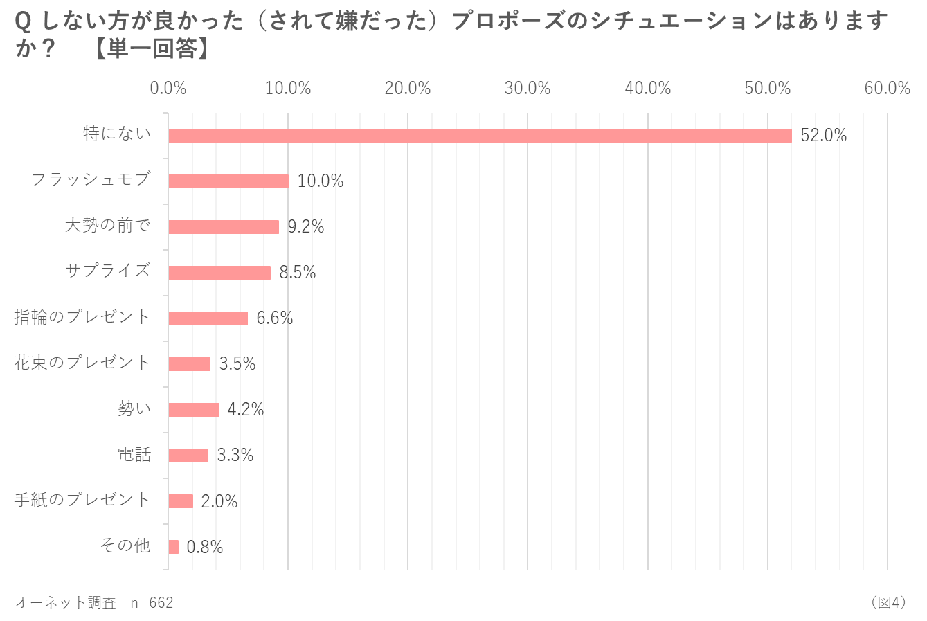 「しない方が良かった(されて嫌だった)プロポーズのシチュエーション」は、「特にない」がダントツのトップで、52.0%を占める結果に。プロポーズのシチュエーションなどよりも、「結婚への想い」を大切に思っていることの表れではないか。次いで多かったのは「フラッシュモブ」が10.0%、「大勢の前で」が9.2%。いずれも人前で行われるようなものが「しない方が良かった(されて嫌だった)プロポーズ」の上位となった。