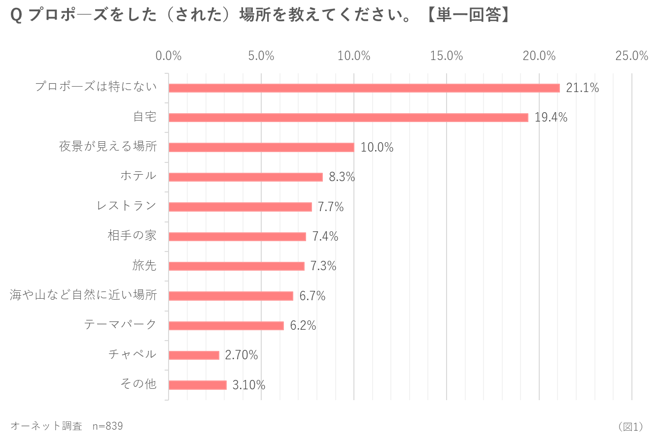 次いで、「夜景が見える場所」で10.0%、「ホテル」が8.3%、「レストラン」が7.7%。非日常な空間でのプロポーズも人気があるようだ。また「プロポーズは特にない」という回答も21.1%で、約2割の人はプロポーズ無しで結婚しているが、一方で8割の人はプロポーズをしていることが分かった。