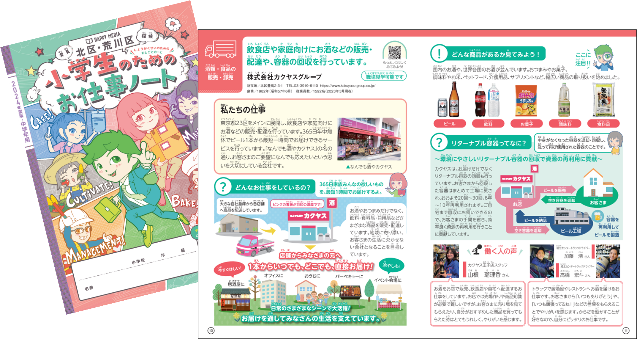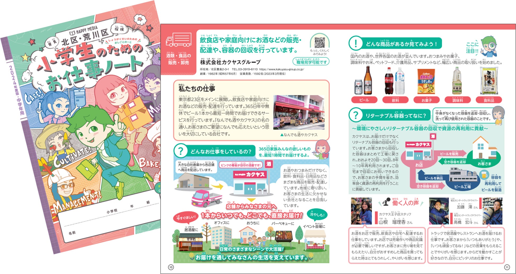 地域の企業、学校、児童の三者をつなぐ1冊として発行される、『北区・荒川区「小学生のためのお仕事ノート」2024年度・中学年用』に、株式会社カクヤスグループ(本社:東京都北区、代表取締役:前垣内洋行、以下:当社グループ)が掲載されました。「小学生のためのお仕事ノート」は株式会社中広が発行されている冊子であり、キャリア教育のための副読本として、北区・荒川区内の小学3・4年生に配布されます(60校、8,689部)。