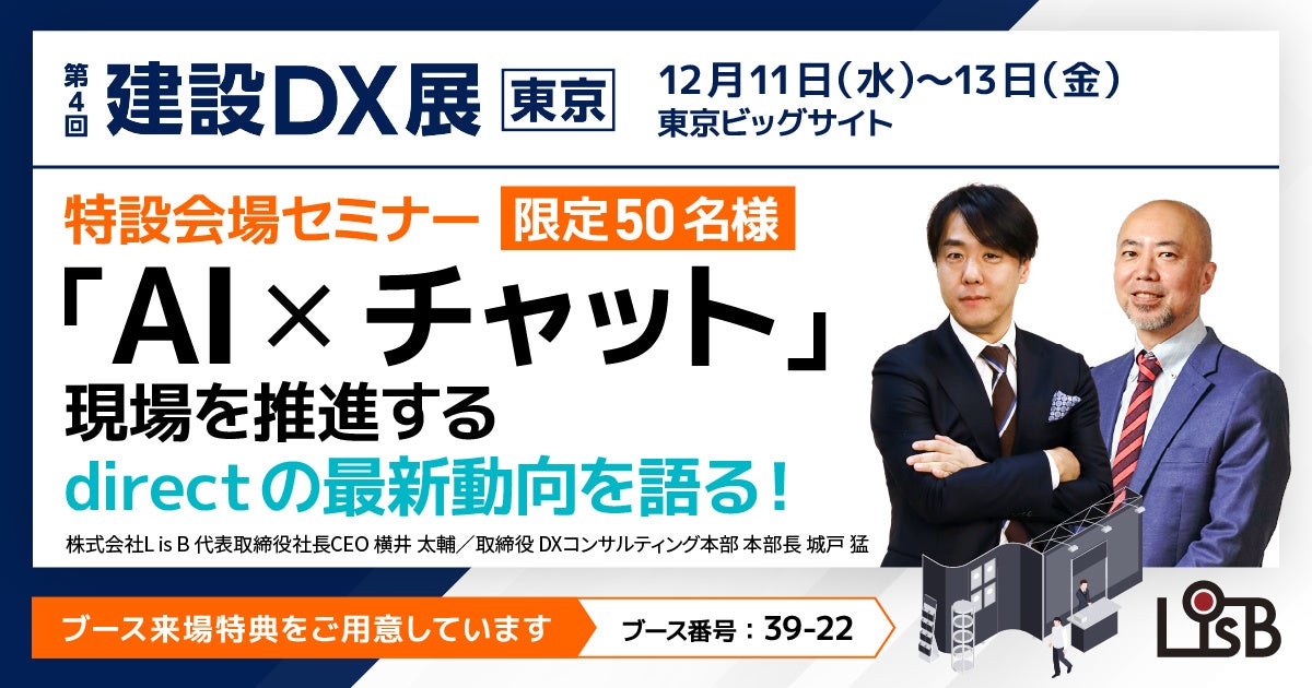 さらに最終日12月13日(金)には、特設会場で実施される特別セミナーに代表 横井が登壇し、【AI×チャット】で現場を推進する「direct」の最新動向をテーマに建設業界の現場DXについてお伝えします。