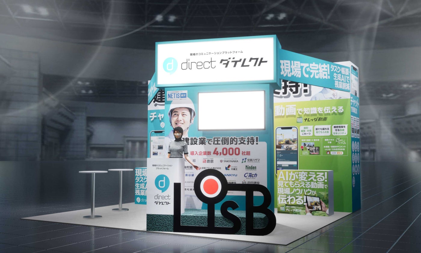 L is Bブースでは、建設業で高い支持を受けている現場向けビジネスチャット「direct/ダイレクト」をはじめ、生成AIを活用した現場の最新事例をご紹介します。さらに現場向けかんたん整理カメラ&クラウド共有「タグショット/タグアルバム」、現場ノウハウを簡単・安全に共有する「ナレッジ動画」などをご案内します。また、各サービスを10分でわかりやすく解説するミニセミナーも実施します。ブース来場特典もご用意しておりますので、ぜひ弊社ブースにお立ち寄りください。