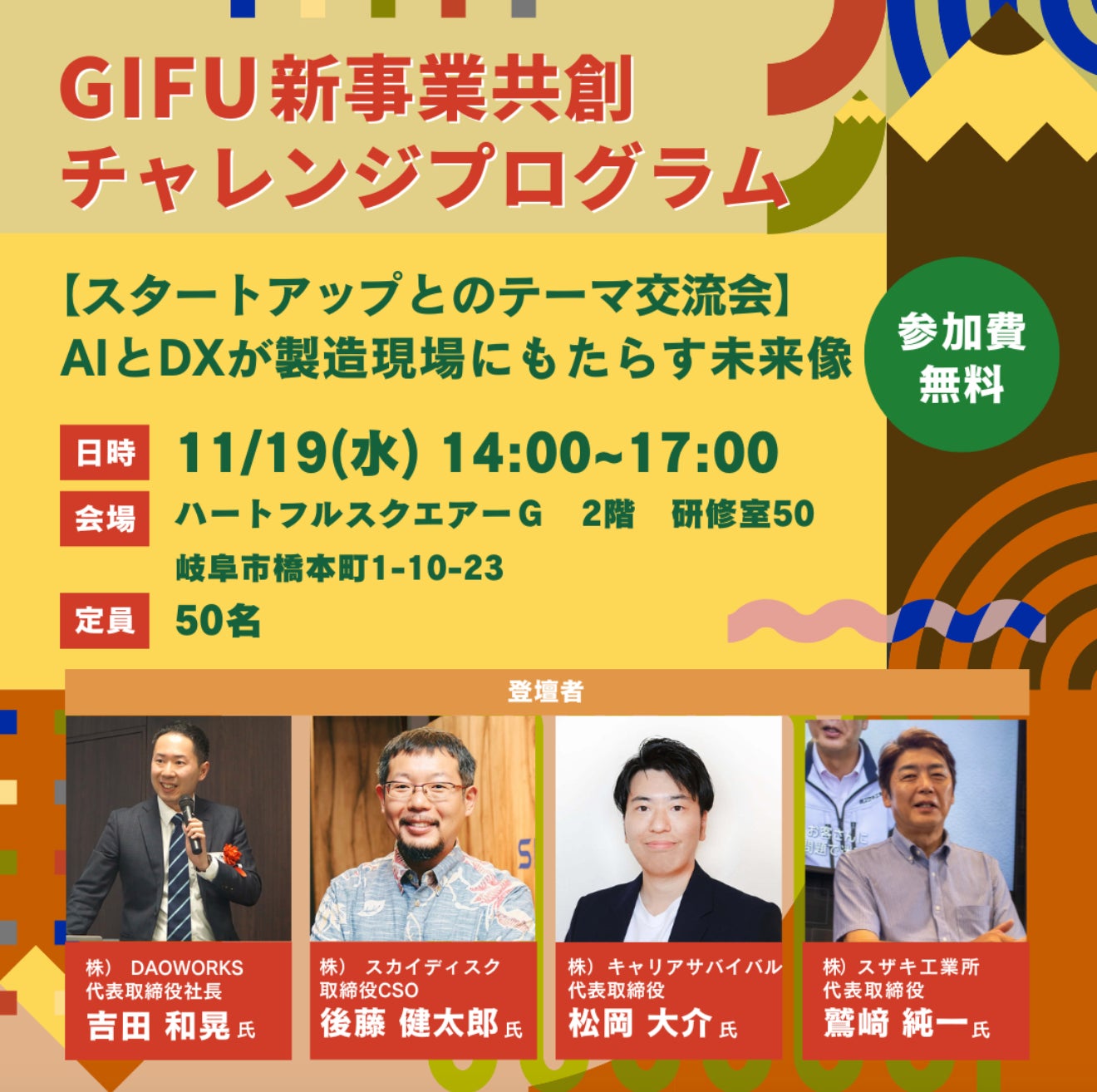 株式会社スカイディスク(本社:福岡県福岡市中央区、代表取締役CEO:内村 安里、以下「スカイディスク」)は、2025年11月19日(水)にハートフルスクエアG(岐阜県岐阜市橋本町)で開催される、岐阜県 商工労働部 産業イノベーション推進課主催のスタートアップとのテーマ交流会「AIとDX系スタートアップが製造現場にもたらす未来像」に登壇いたします。