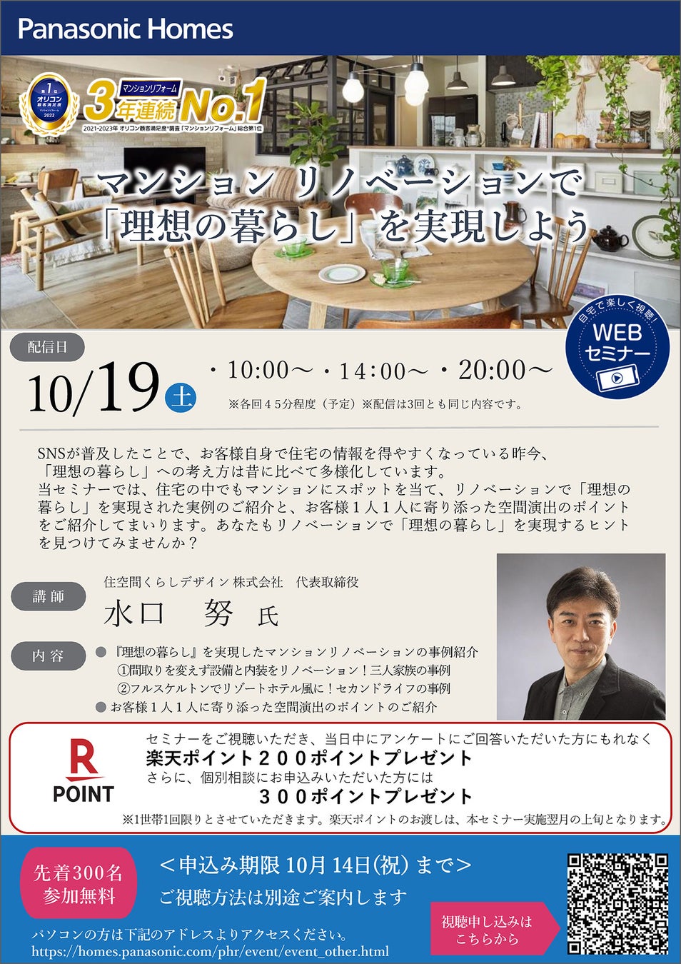 パナソニック ホームズ株式会社のグループ会社、パナソニック リフォーム株式会社は、素敵な空間演出のポイントを紹介するWEBセミナー 『マンションリノベーションで「理想の暮らし」を実現しよう』を、10月19日(土)10:00-10:45/14:00-14:45/20:00-20:45に開催します。