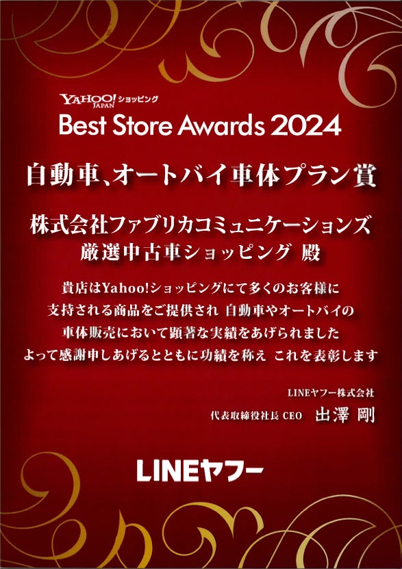株式会社ファブリカホールディングス(本社:東京都港区、代表取締役社長CEO:谷口政人)の完全子会社、株式会社ファブリカコミュニケーションズ(本社:愛知県名古屋市中区、代表取締役社長CEO:谷口政人、以下「当社」)が運営する「厳選中古車ショッピング」が2025年3月7日(金)にLINEヤフー株式会社(本社:東京都千代田区、代表取締役社長CEO:出澤剛、以下LINEヤフー)が主催するBest Store Awards 2024にて「自動車、オートバイ車体プラン賞」を受賞いたしました。本受賞は2013年から12年連続となります。