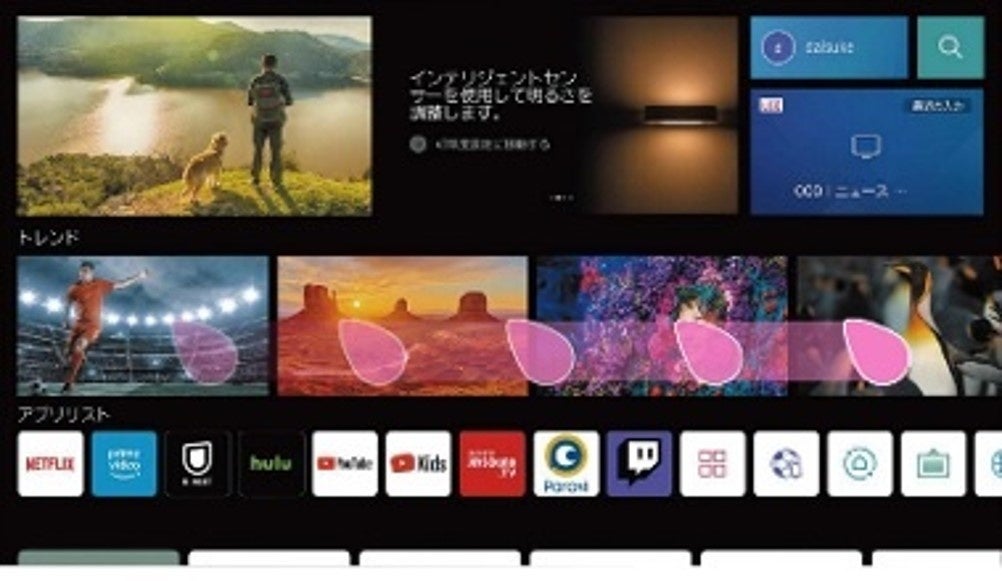 マウスを接続すればパソコンのように操作ができ、ThinQアプリ※をインストールすれば、スマートフォンでも操作が可能。一般的なリモコンにはない自由度の高い操作性が特徴です。例えば、インターネットを楽しめるウェブブラウザ※での操作は、検索ワードの文字入力が必要ですが、一般的なテレビの場合、何度もリモコンのボタンを押さなければならなかったのに対し、マウスやキーボード、スマホアプリに対応するwebOSは、直観的かつスムーズに入力が可能です。また、アカウントを登録することで、アカウントごとに視聴傾向や人気コンテンツからwebOS上にお勧めのコンテンツを表示します。