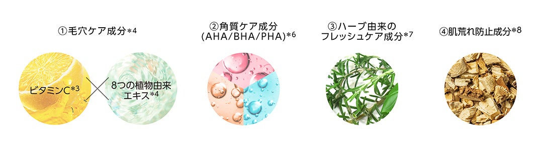 *4 製品の抗酸化剤:アスコルビン酸、保湿成分:カキ葉エキス、ブドウ果実エキス、コーヒー種子エキス、ベニバナ花エキス、イタドリ根エキス、チャ葉エキス、クリ殻エキス、サンショウ果実エキス