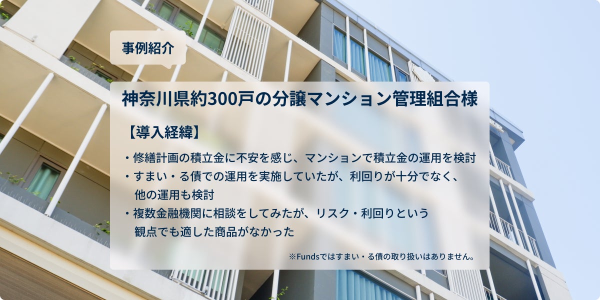 一方で当社では、上場企業を対象とした貸付投資という新たな運用手段を提供しております。当社が提供する資産運用サービス「Funds」では、管理組合の運用方針に応じて、予定運用期間は1年〜3年程度、また予定利回りは年率1-3%程度(税引前)で、手数料は無料、値動きのない円建てで運用することが可能です。これまで800億円の募集を行い、元本欠損・遅延は0件となっております。(2024年11月末日現在。なお、将来の運用成果を保証するものではありません。)