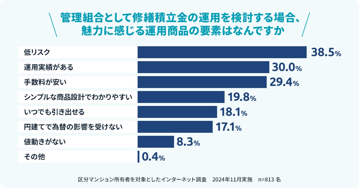 そこで、運用を検討する場合に管理組合にはどのようなニーズがあるのか、区分マンション所有者を対象にしたインターネット調査を実施したところ、以下の回答(複数回答可)が得られました。