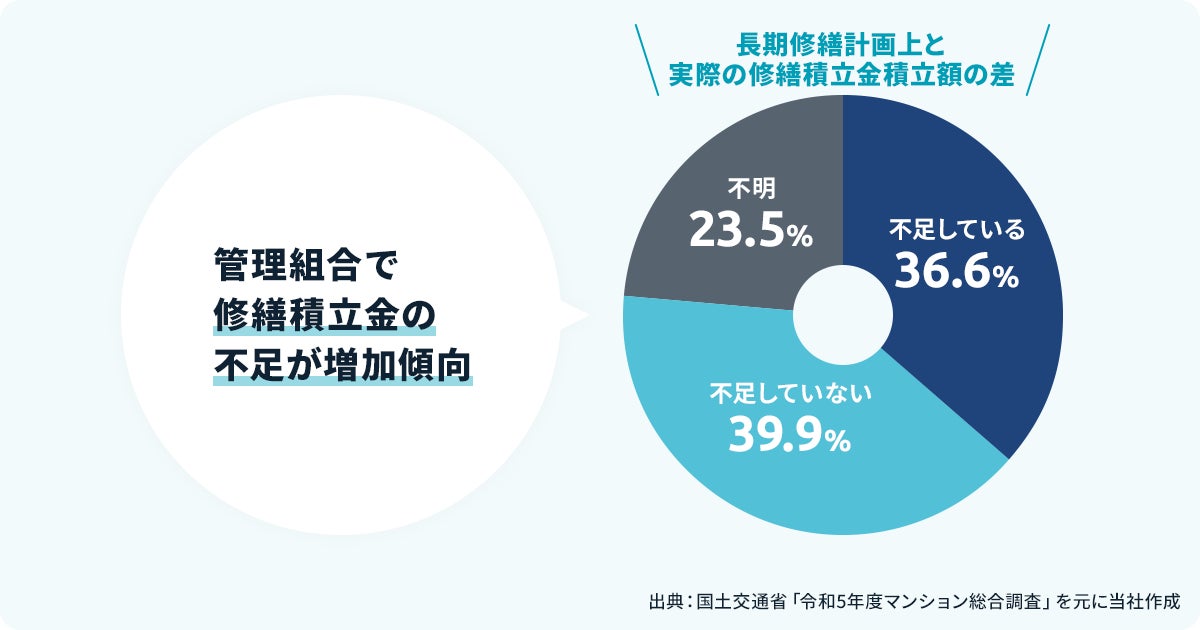 マンション管理組合では定期的に実施される修繕等に向けて、毎月住民から修繕積立金を集めていますが、「段階増額積立方式」となっている割合が高い傾向にあります。しかし、この段階的な引き上げが計画どおりに実施されないケースや、昨今の人件費や資材費の高騰に伴う修繕費用の上昇などにより、国土交通省の調査によると、当初予定していた大規模修繕を行うための修繕積立金が不足しているという回答が36.6%となっています。