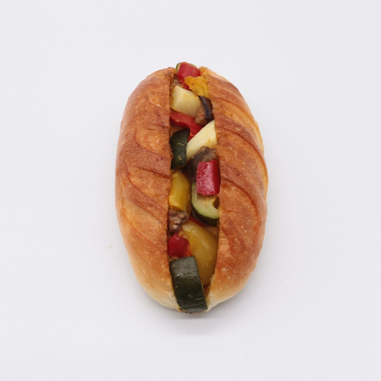 自家製カレーを野菜とともにホットドッグ風にアレンジ。カレーは辛くなく、野菜とフルーツが溶け込んだ優しい甘味のある仕上がりになっています。