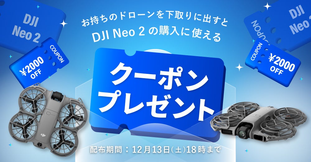 DJI製のドローンの中古買取査定をお申し込みいただくと、DJI Neo 2をおトクにお求めいただける特別クーポンをもれなくプレゼントいたします。